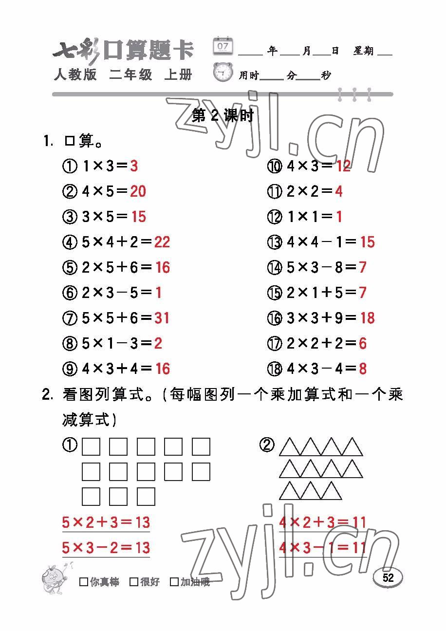 注:目前有些书本章节名称可能整理的还不是很完善,但都是按照顺序排列的,请同学们按照顺序仔细查找。练习册 2022年七彩口算题卡二年级数学上册人教版 答案主要是用来给同学们做完题方便对答案用的,请勿直接抄袭。