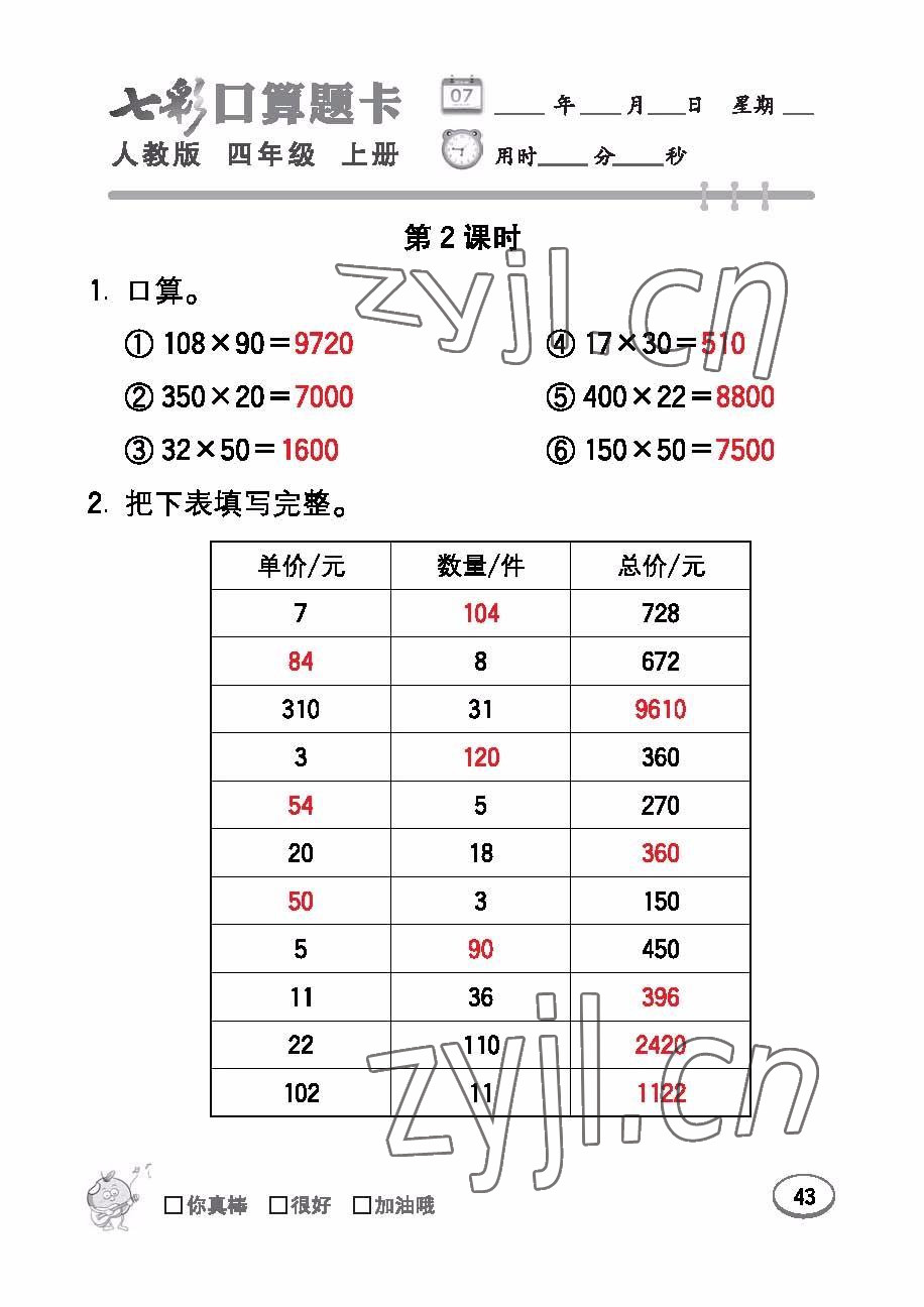 注:目前有些书本章节名称可能整理的还不是很完善,但都是按照顺序排列的,请同学们按照顺序仔细查找。练习册 2022年七彩口算题卡四年级数学上册人教版 答案主要是用来给同学们做完题方便对答案用的,请勿直接抄袭。
