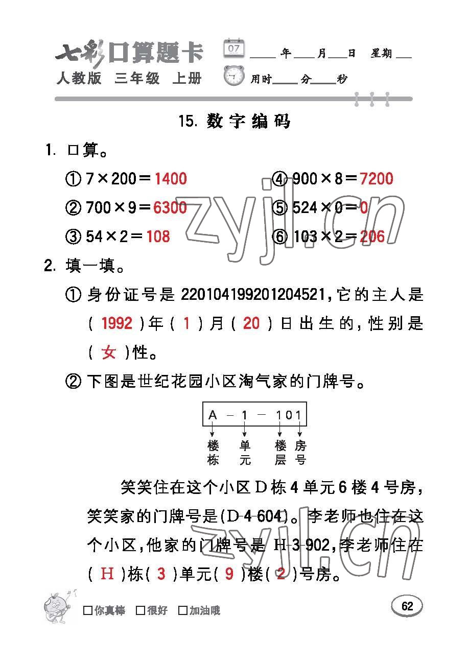 注:目前有些书本章节名称可能整理的还不是很完善,但都是按照顺序排列的,请同学们按照顺序仔细查找。练习册 2022年七彩口算题卡三年级数学上册人教版 答案主要是用来给同学们做完题方便对答案用的,请勿直接抄袭。
