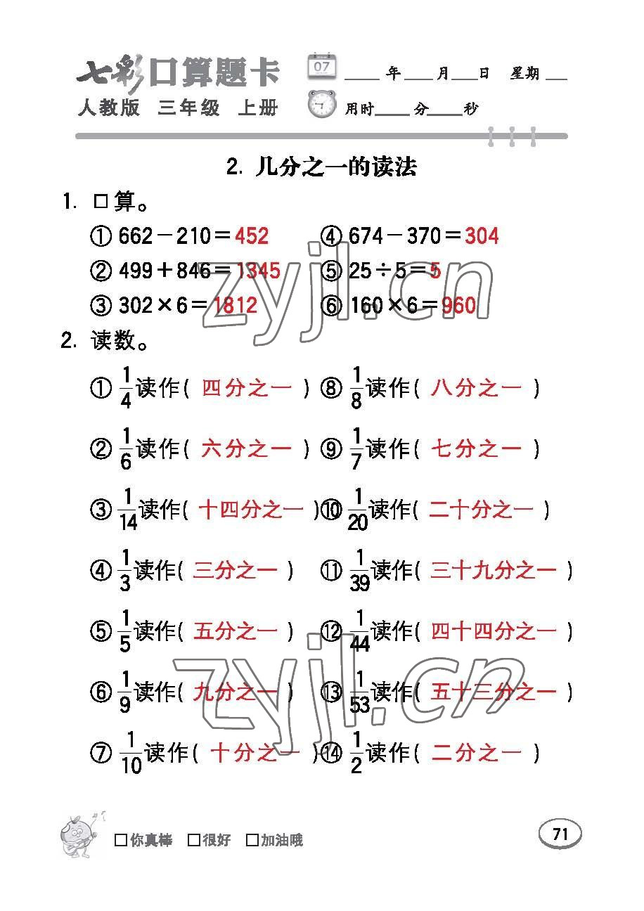 注:目前有些书本章节名称可能整理的还不是很完善,但都是按照顺序排列的,请同学们按照顺序仔细查找。练习册 2022年七彩口算题卡三年级数学上册人教版 答案主要是用来给同学们做完题方便对答案用的,请勿直接抄袭。