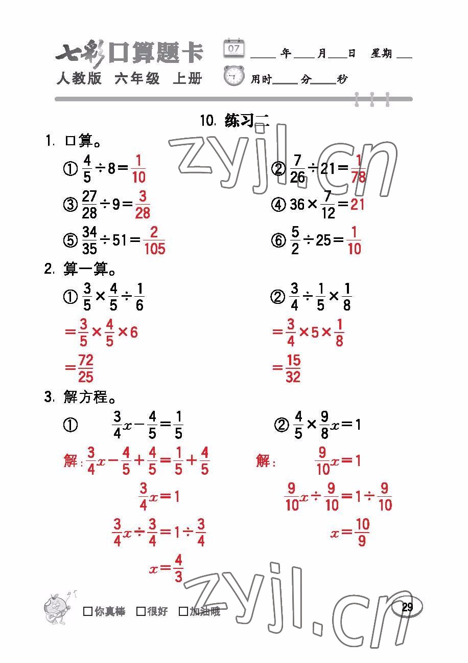 注:目前有些书本章节名称可能整理的还不是很完善,但都是按照顺序排列的,请同学们按照顺序仔细查找。练习册 2022年七彩口算题卡六年级数学上册人教版 答案主要是用来给同学们做完题方便对答案用的,请勿直接抄袭。