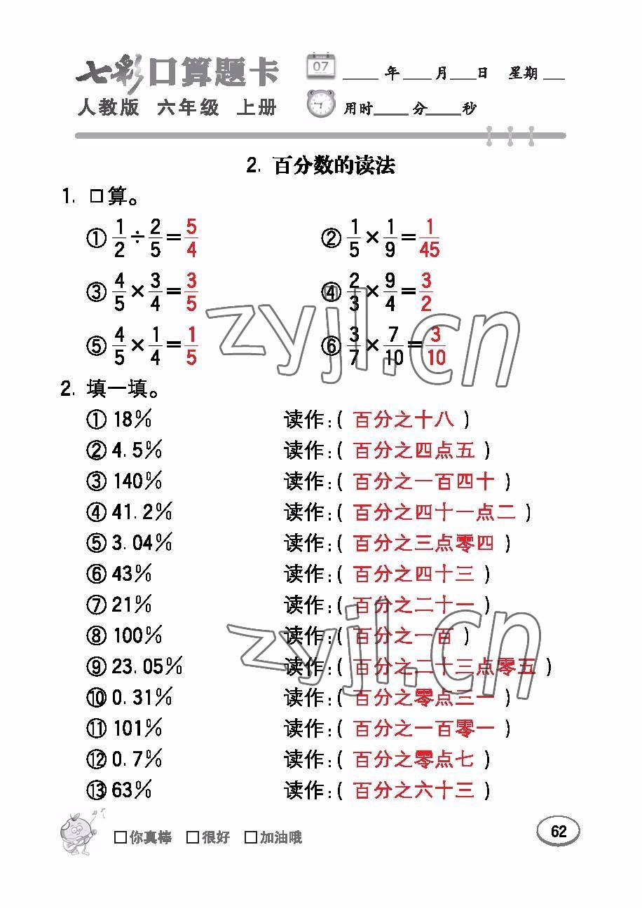 注:目前有些书本章节名称可能整理的还不是很完善,但都是按照顺序排列的,请同学们按照顺序仔细查找。练习册 2022年七彩口算题卡六年级数学上册人教版 答案主要是用来给同学们做完题方便对答案用的,请勿直接抄袭。