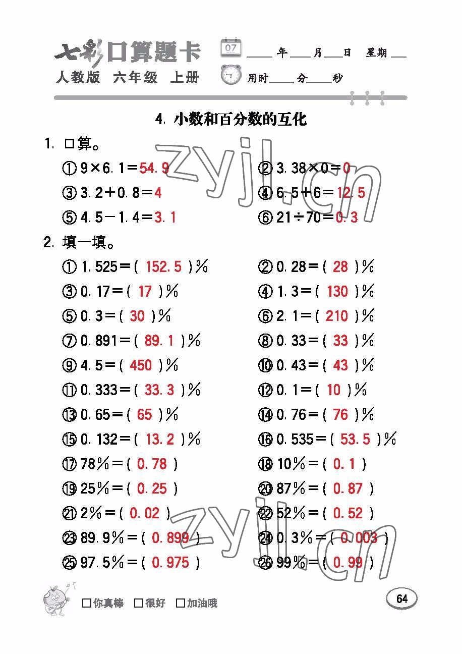 注:目前有些书本章节名称可能整理的还不是很完善,但都是按照顺序排列的,请同学们按照顺序仔细查找。练习册 2022年七彩口算题卡六年级数学上册人教版 答案主要是用来给同学们做完题方便对答案用的,请勿直接抄袭。