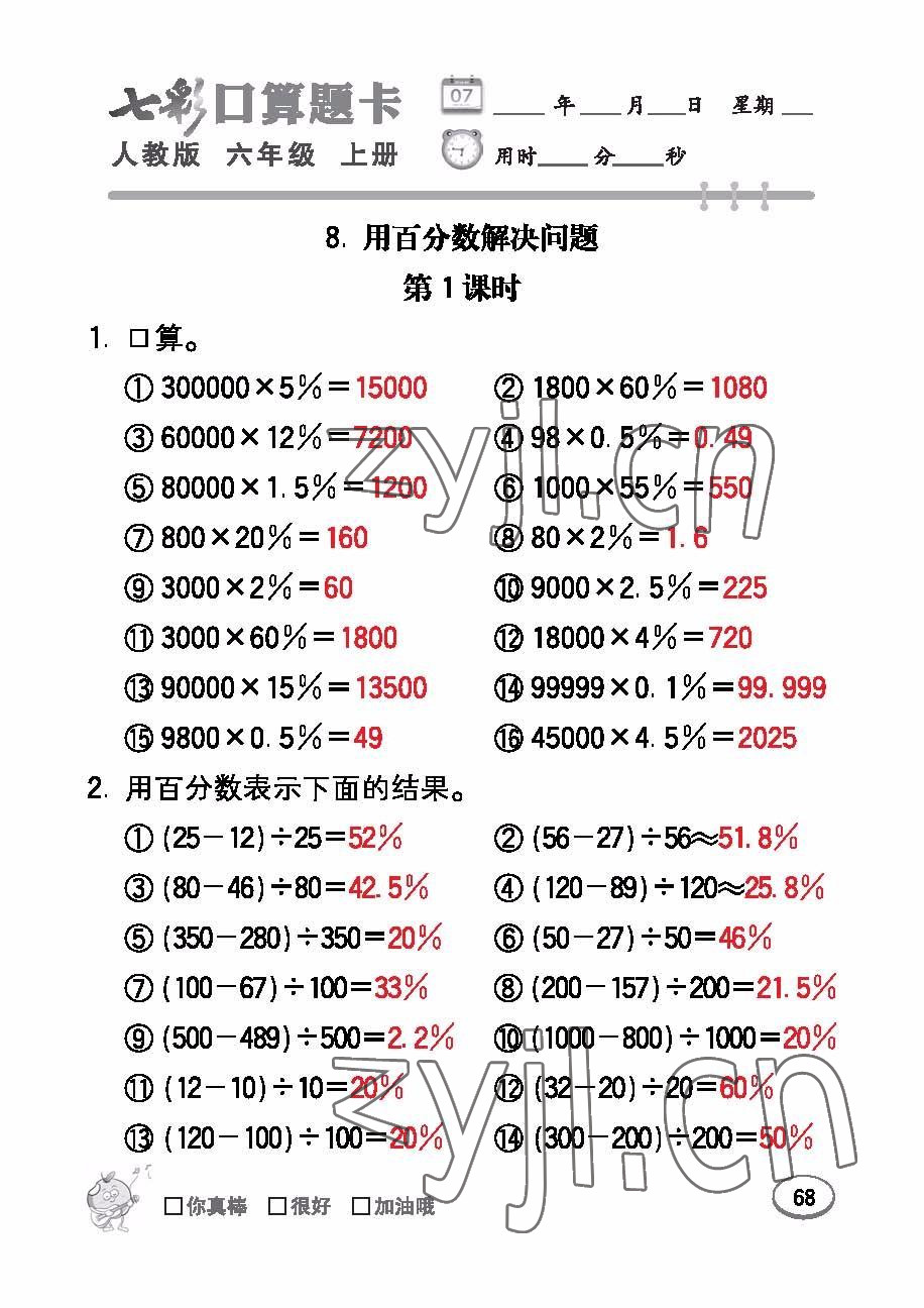 注:目前有些书本章节名称可能整理的还不是很完善,但都是按照顺序排列的,请同学们按照顺序仔细查找。练习册 2022年七彩口算题卡六年级数学上册人教版 答案主要是用来给同学们做完题方便对答案用的,请勿直接抄袭。