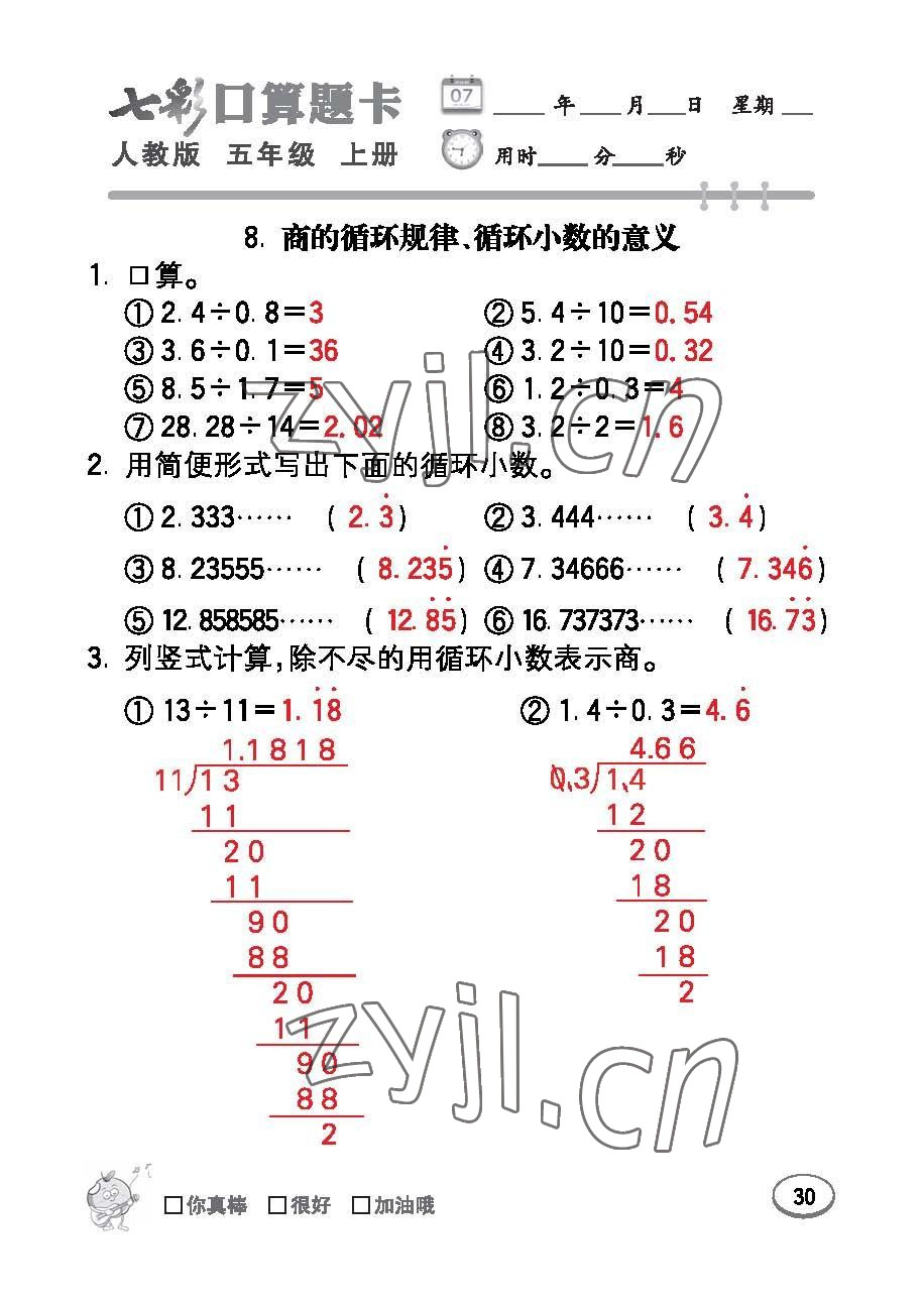 注:目前有些书本章节名称可能整理的还不是很完善,但都是按照顺序排列的,请同学们按照顺序仔细查找。练习册 2022年七彩口算题卡五年级数学上册人教版 答案主要是用来给同学们做完题方便对答案用的,请勿直接抄袭。