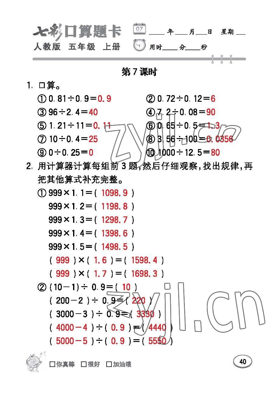2022年七彩口算题卡五年级数学上册人教版