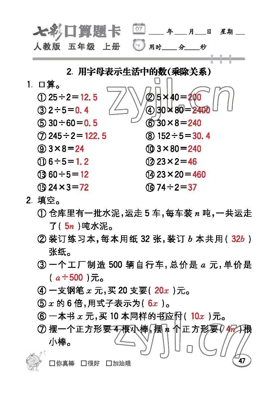 注:目前有些书本章节名称可能整理的还不是很完善,但都是按照顺序排列的,请同学们按照顺序仔细查找。练习册 2022年七彩口算题卡五年级数学上册人教版 答案主要是用来给同学们做完题方便对答案用的,请勿直接抄袭。
