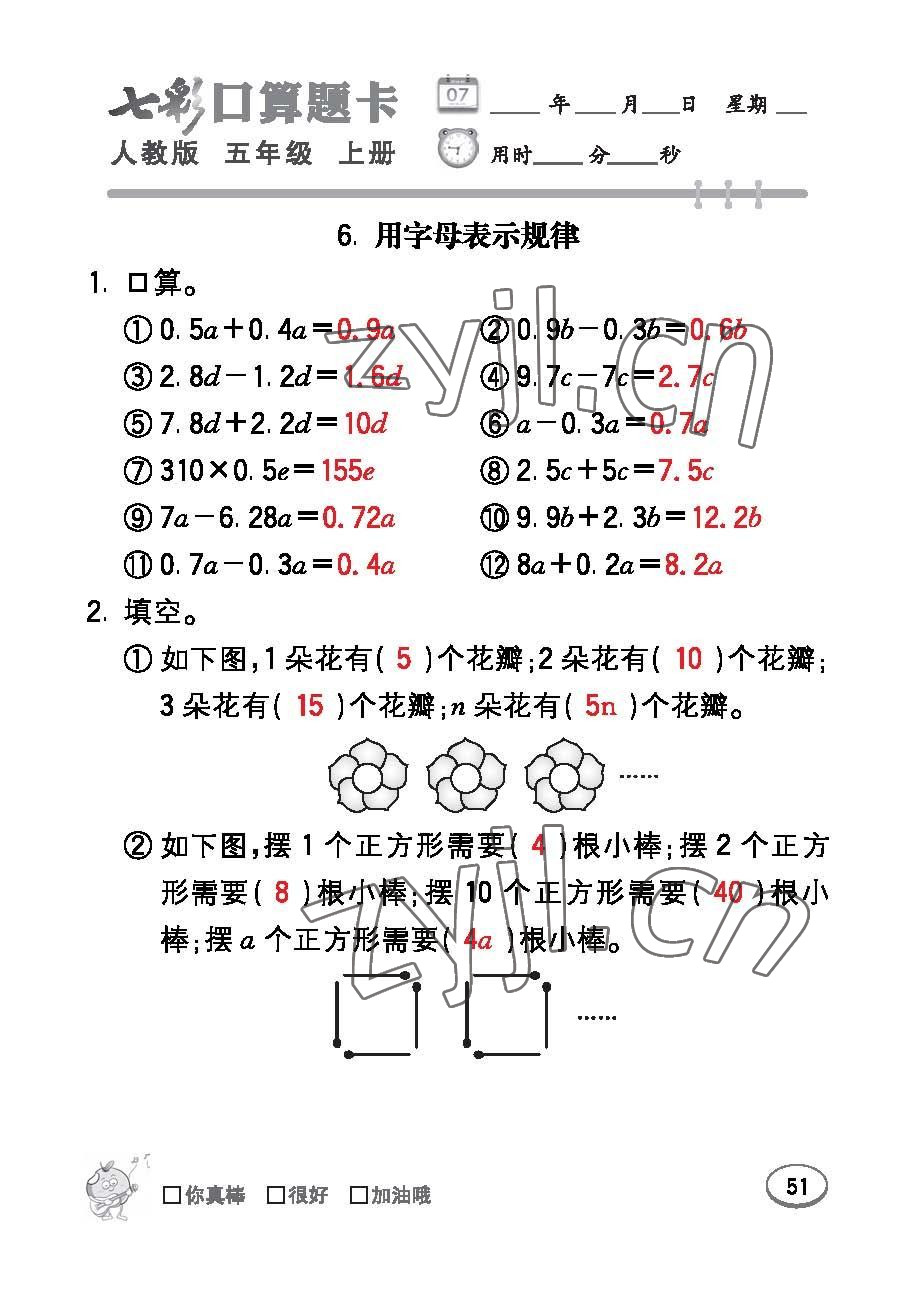 注:目前有些书本章节名称可能整理的还不是很完善,但都是按照顺序排列的,请同学们按照顺序仔细查找。练习册 2022年七彩口算题卡五年级数学上册人教版 答案主要是用来给同学们做完题方便对答案用的,请勿直接抄袭。