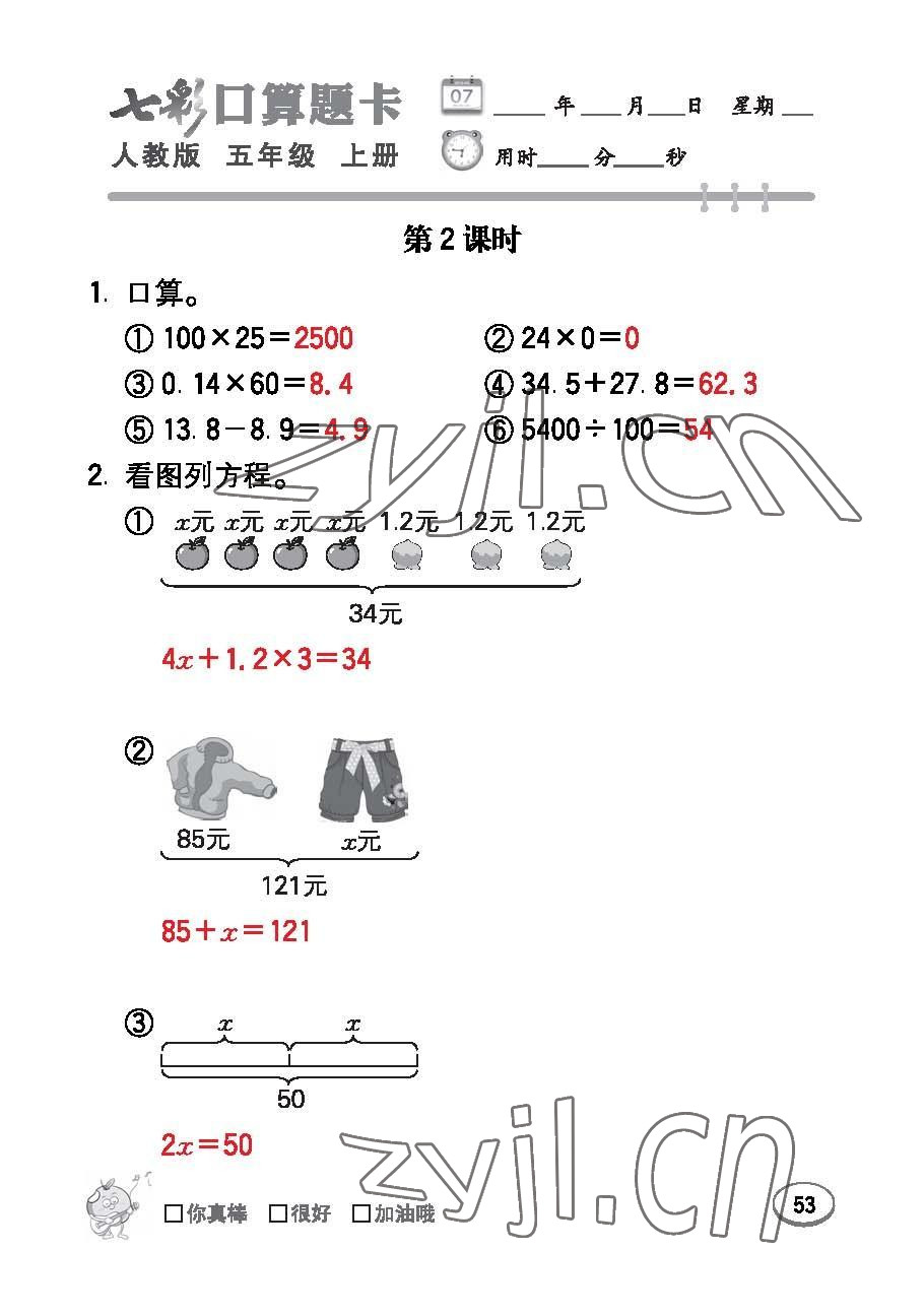 注:目前有些书本章节名称可能整理的还不是很完善,但都是按照顺序排列的,请同学们按照顺序仔细查找。练习册 2022年七彩口算题卡五年级数学上册人教版 答案主要是用来给同学们做完题方便对答案用的,请勿直接抄袭。