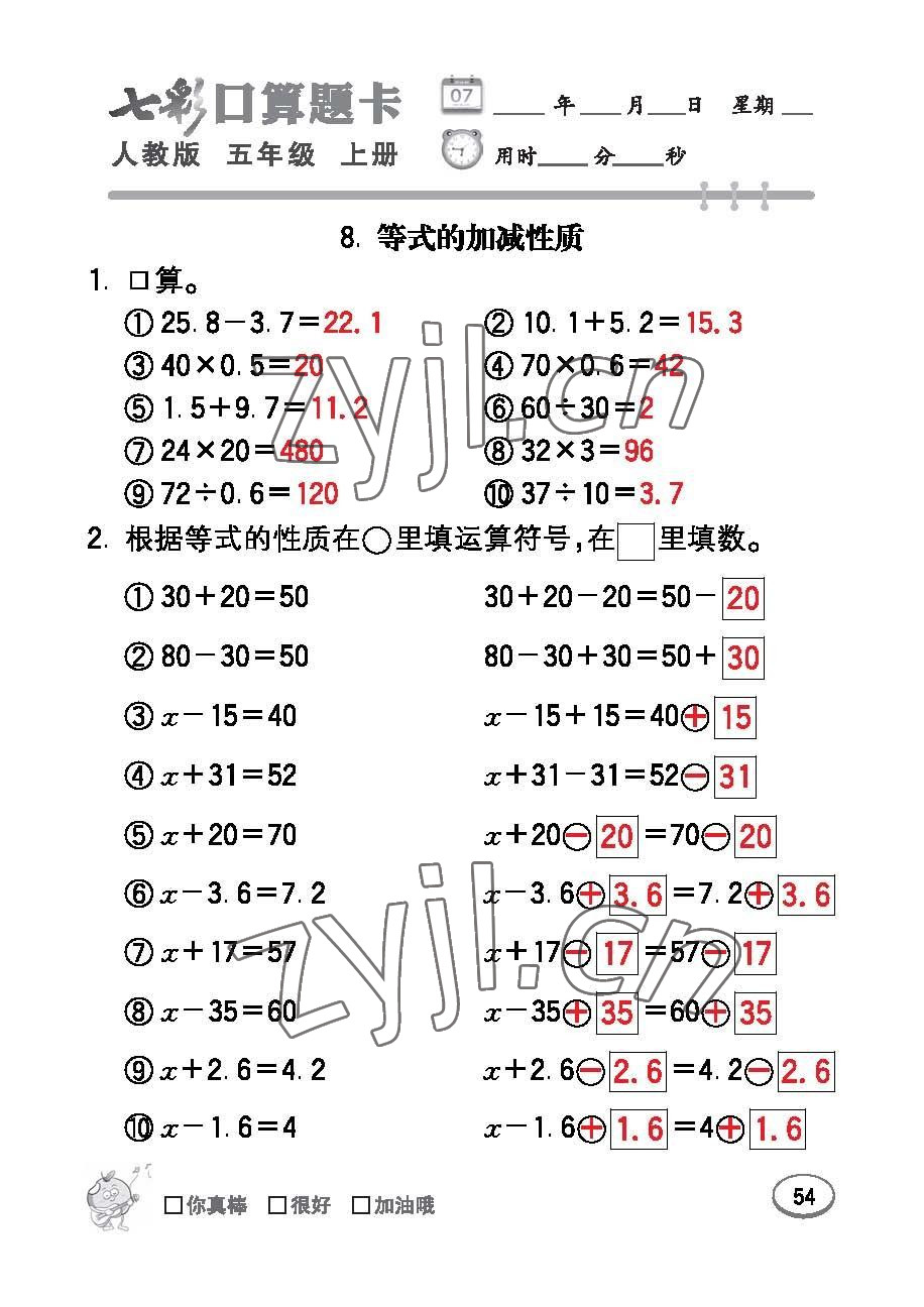 注:目前有些书本章节名称可能整理的还不是很完善,但都是按照顺序排列的,请同学们按照顺序仔细查找。练习册 2022年七彩口算题卡五年级数学上册人教版 答案主要是用来给同学们做完题方便对答案用的,请勿直接抄袭。
