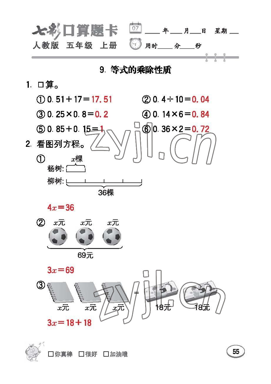 注:目前有些书本章节名称可能整理的还不是很完善,但都是按照顺序排列的,请同学们按照顺序仔细查找。练习册 2022年七彩口算题卡五年级数学上册人教版 答案主要是用来给同学们做完题方便对答案用的,请勿直接抄袭。