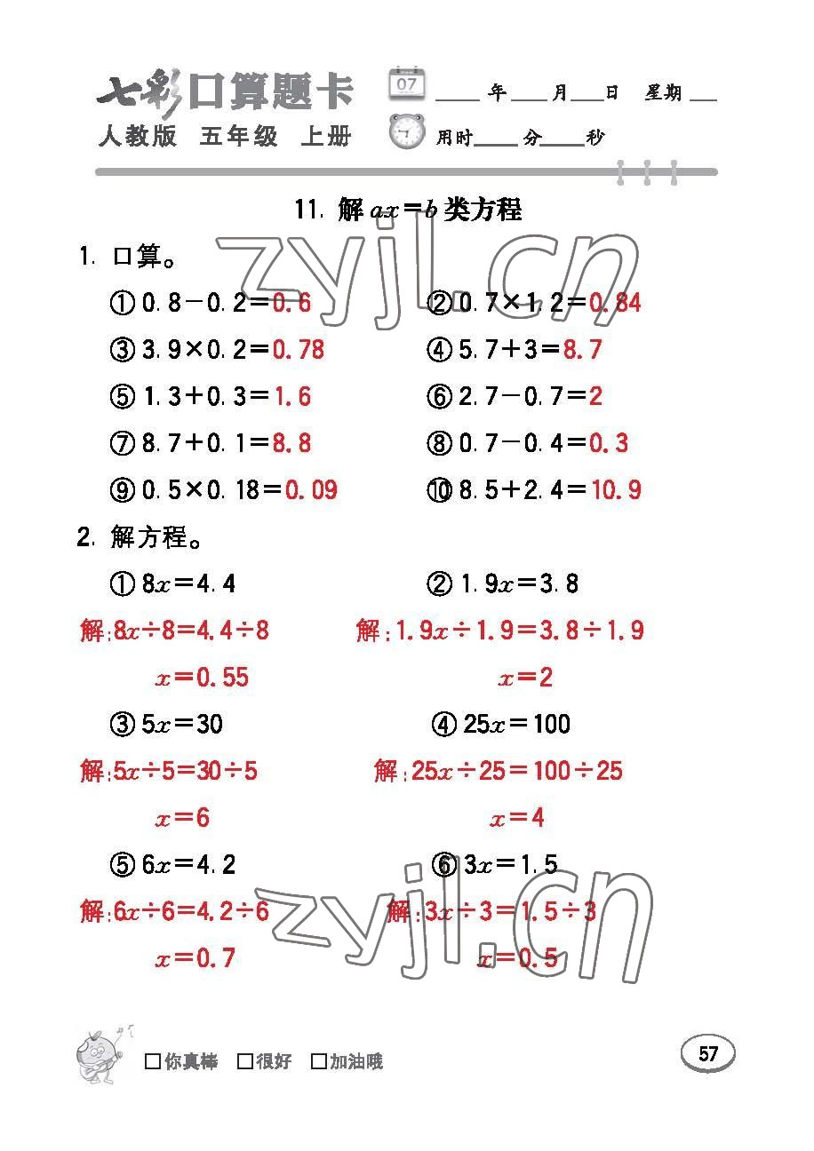 注:目前有些书本章节名称可能整理的还不是很完善,但都是按照顺序排列的,请同学们按照顺序仔细查找。练习册 2022年七彩口算题卡五年级数学上册人教版 答案主要是用来给同学们做完题方便对答案用的,请勿直接抄袭。
