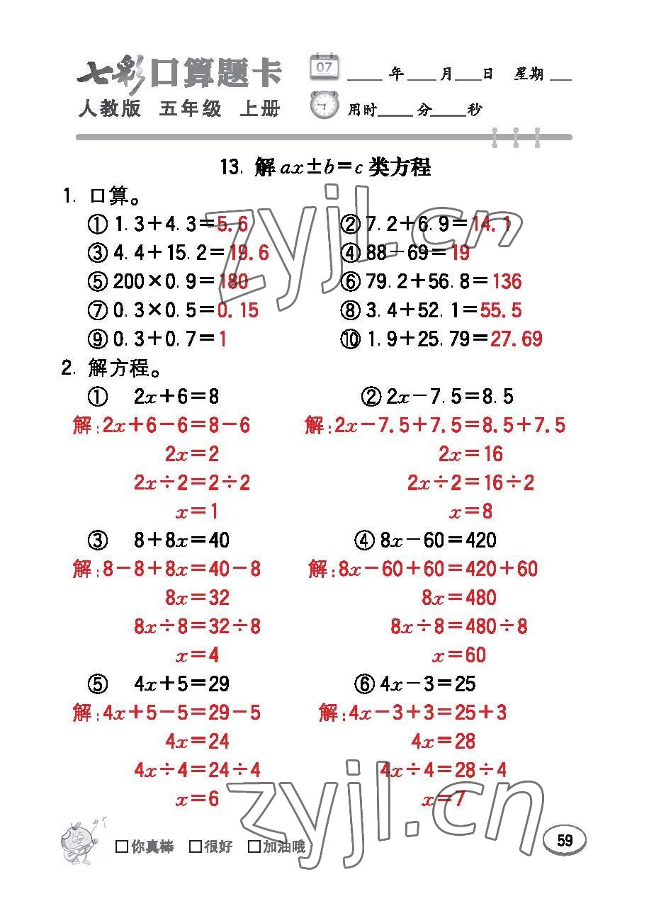 注:目前有些书本章节名称可能整理的还不是很完善,但都是按照顺序排列的,请同学们按照顺序仔细查找。练习册 2022年七彩口算题卡五年级数学上册人教版 答案主要是用来给同学们做完题方便对答案用的,请勿直接抄袭。
