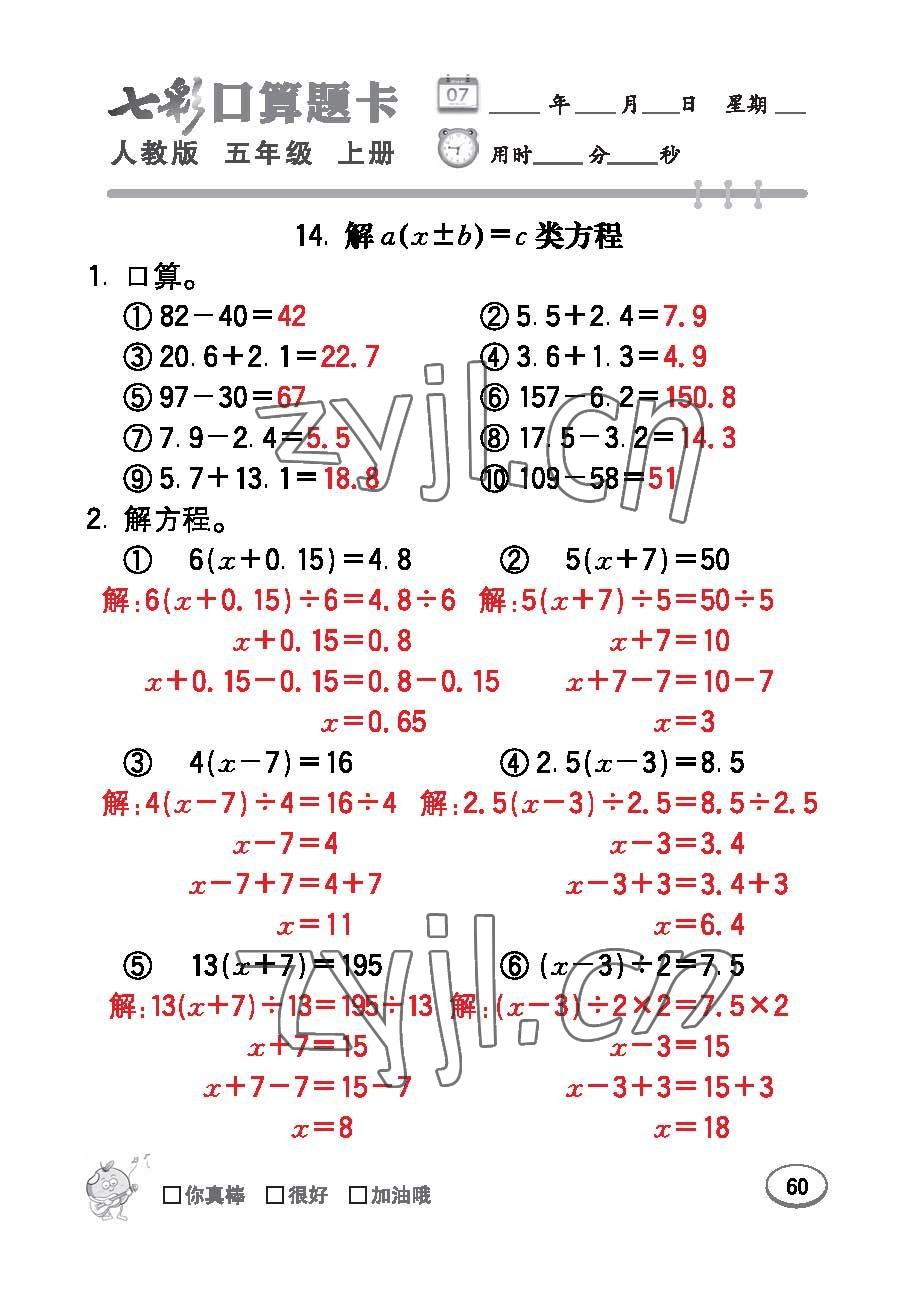 注:目前有些书本章节名称可能整理的还不是很完善,但都是按照顺序排列的,请同学们按照顺序仔细查找。练习册 2022年七彩口算题卡五年级数学上册人教版 答案主要是用来给同学们做完题方便对答案用的,请勿直接抄袭。