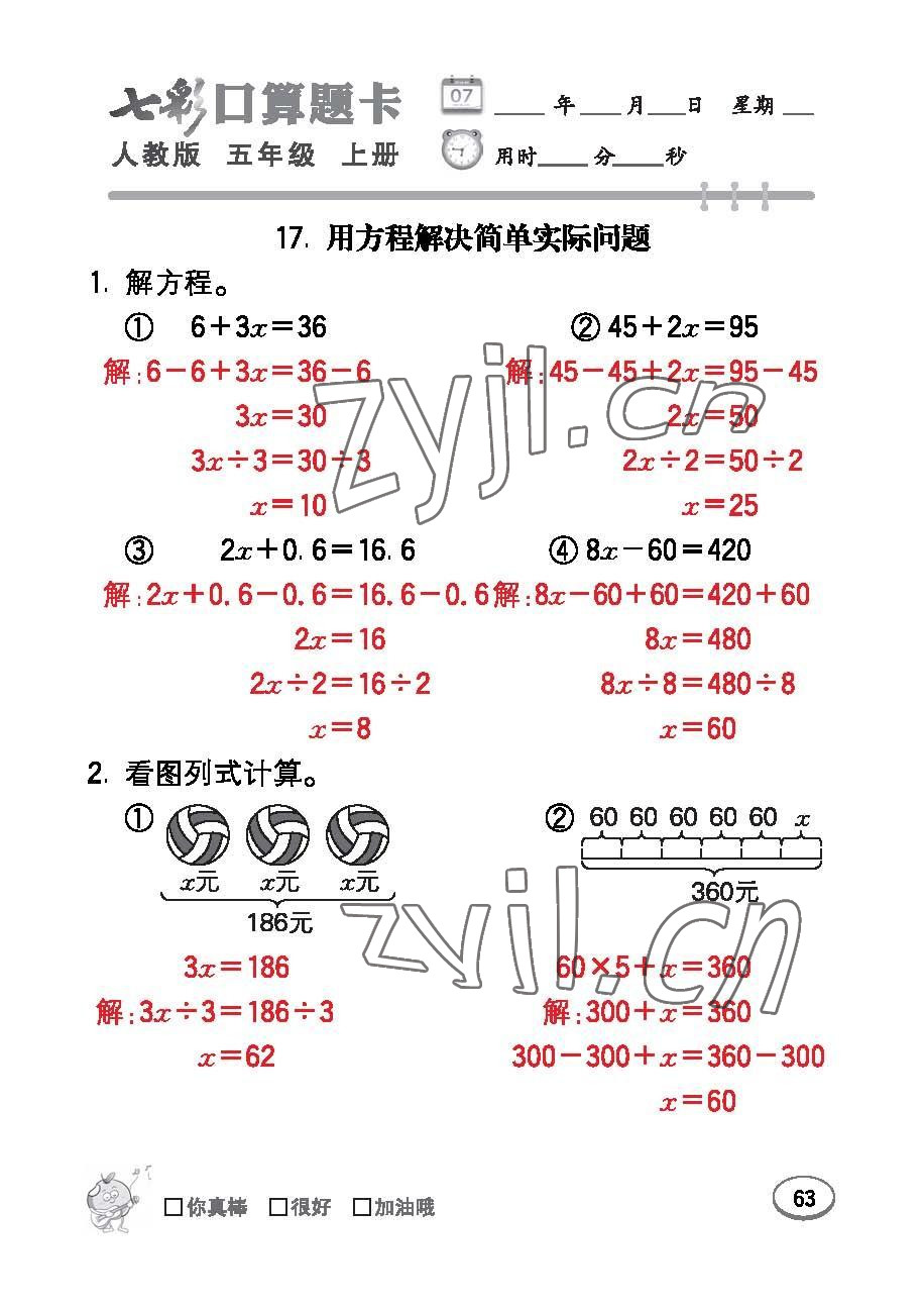 注:目前有些书本章节名称可能整理的还不是很完善,但都是按照顺序排列的,请同学们按照顺序仔细查找。练习册 2022年七彩口算题卡五年级数学上册人教版 答案主要是用来给同学们做完题方便对答案用的,请勿直接抄袭。