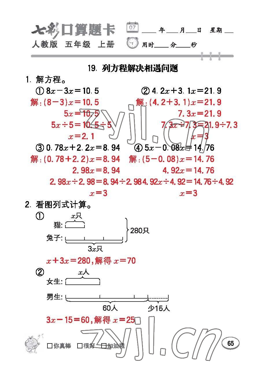 注:目前有些书本章节名称可能整理的还不是很完善,但都是按照顺序排列的,请同学们按照顺序仔细查找。练习册 2022年七彩口算题卡五年级数学上册人教版 答案主要是用来给同学们做完题方便对答案用的,请勿直接抄袭。