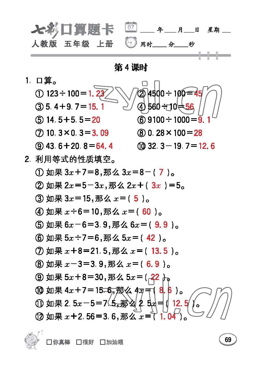 注:目前有些书本章节名称可能整理的还不是很完善,但都是按照顺序排列的,请同学们按照顺序仔细查找。练习册 2022年七彩口算题卡五年级数学上册人教版 答案主要是用来给同学们做完题方便对答案用的,请勿直接抄袭。