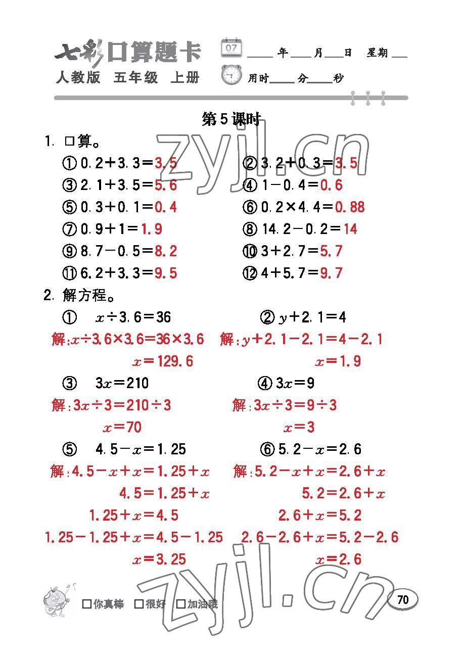 注:目前有些书本章节名称可能整理的还不是很完善,但都是按照顺序排列的,请同学们按照顺序仔细查找。练习册 2022年七彩口算题卡五年级数学上册人教版 答案主要是用来给同学们做完题方便对答案用的,请勿直接抄袭。