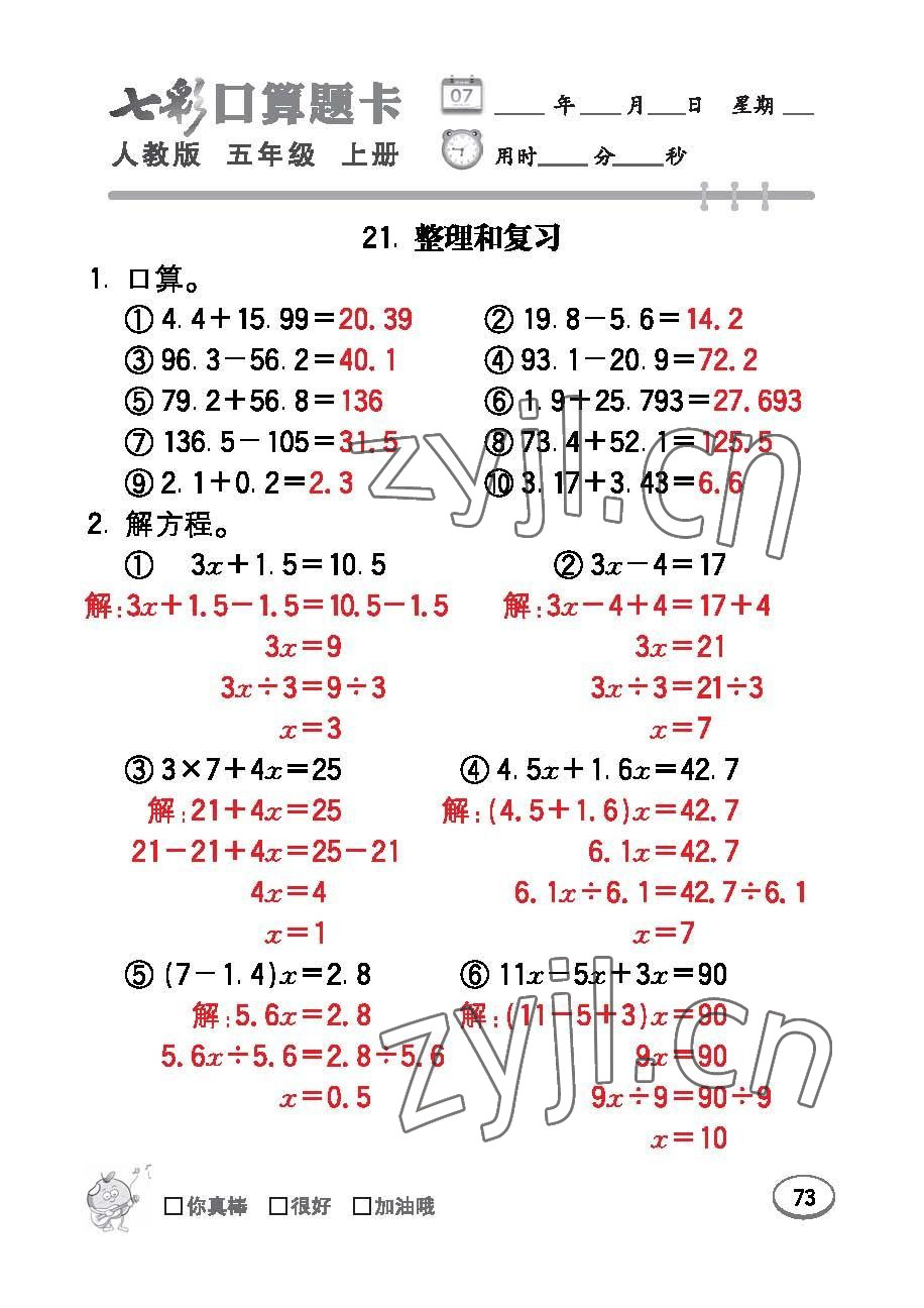 注:目前有些书本章节名称可能整理的还不是很完善,但都是按照顺序排列的,请同学们按照顺序仔细查找。练习册 2022年七彩口算题卡五年级数学上册人教版 答案主要是用来给同学们做完题方便对答案用的,请勿直接抄袭。