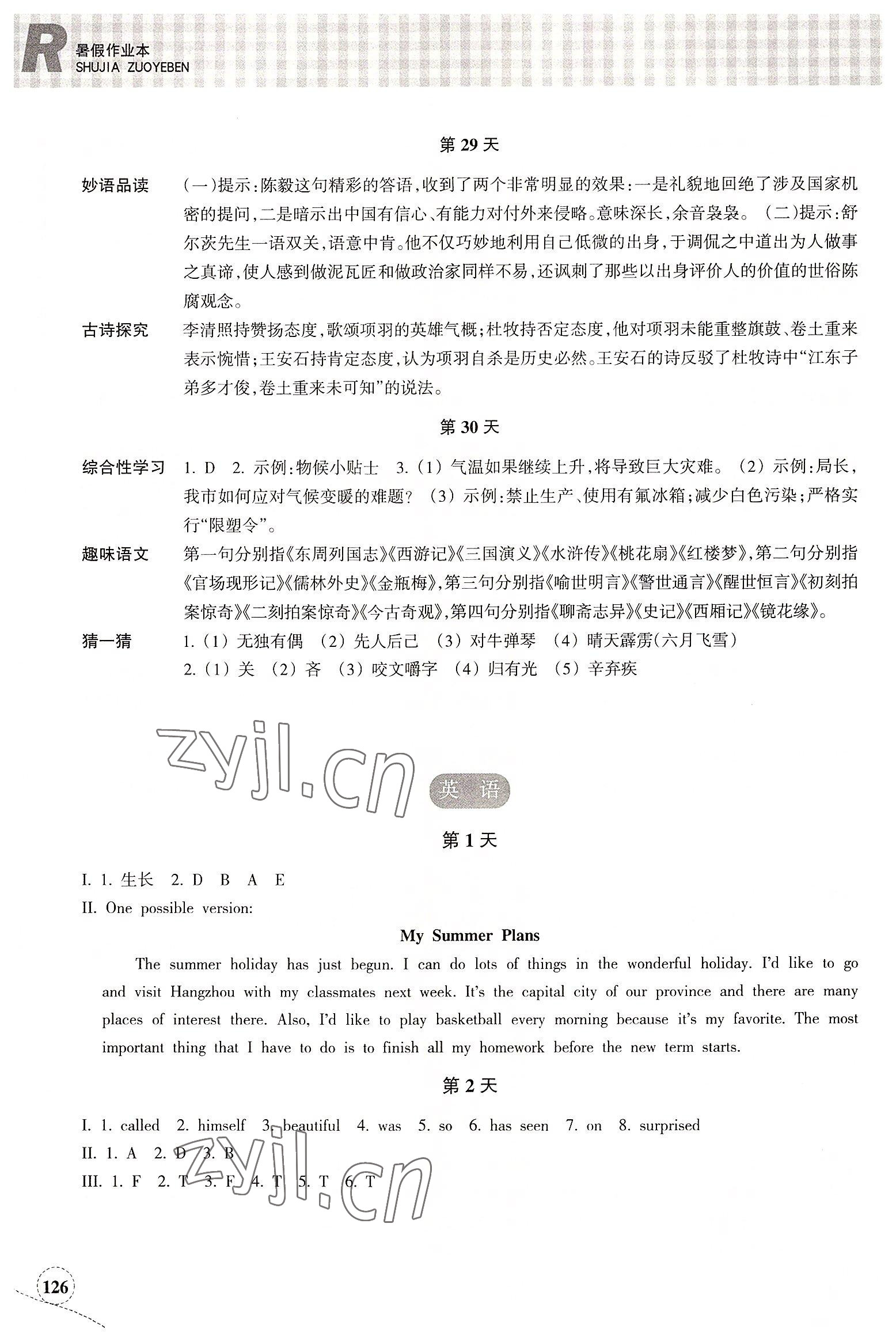 《2022年暑假作业本浙江教育出版社八年级语文英语人教版》