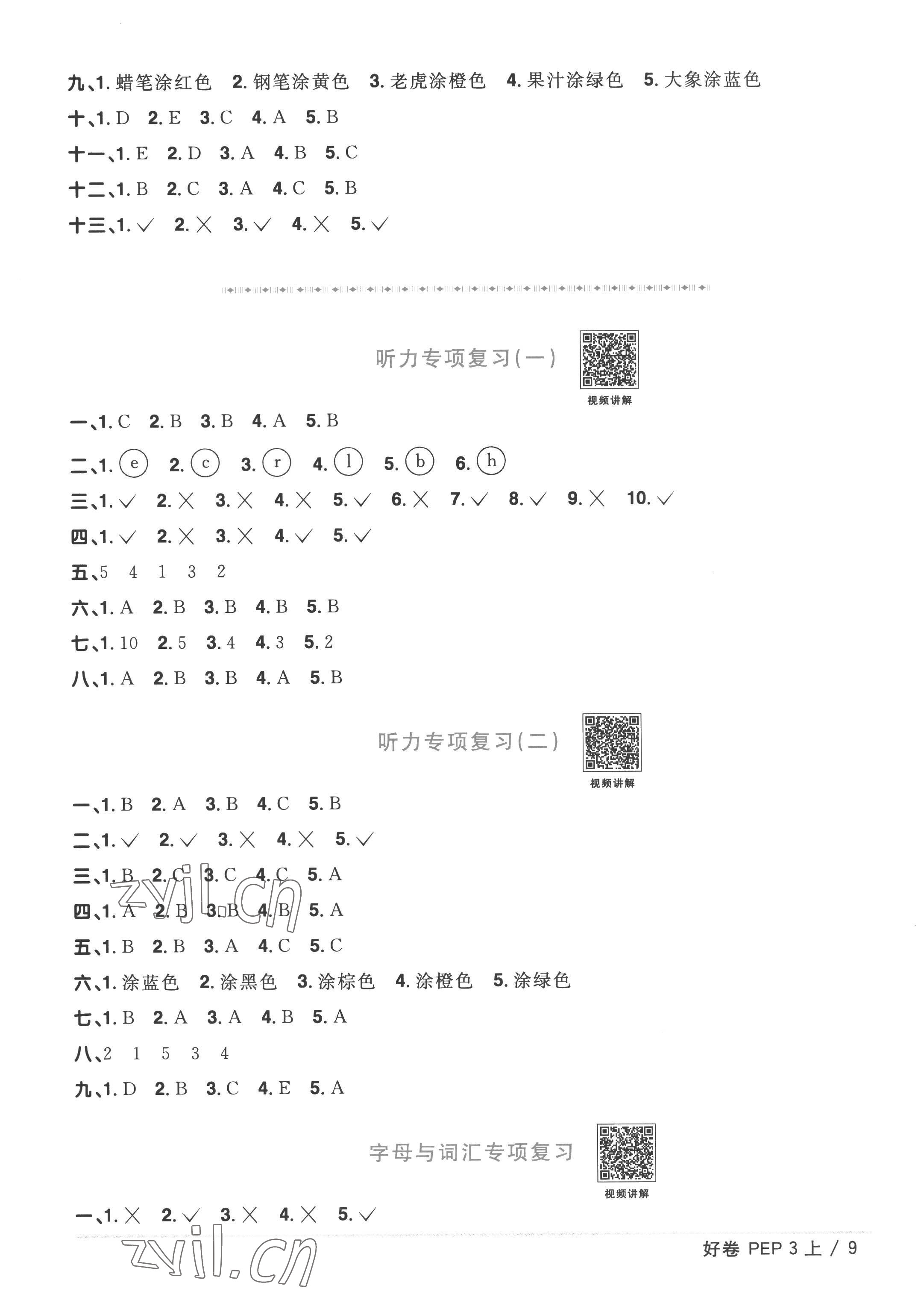 注:目前有些书本章节名称可能整理的还不是很完善,但都是按照顺序排列的,请同学们按照顺序仔细查找。练习册 2022年阳光同学一线名师全优好卷三年级英语上册人教PEP版 答案主要是用来给同学们做完题方便对答案用的,请勿直接抄袭。