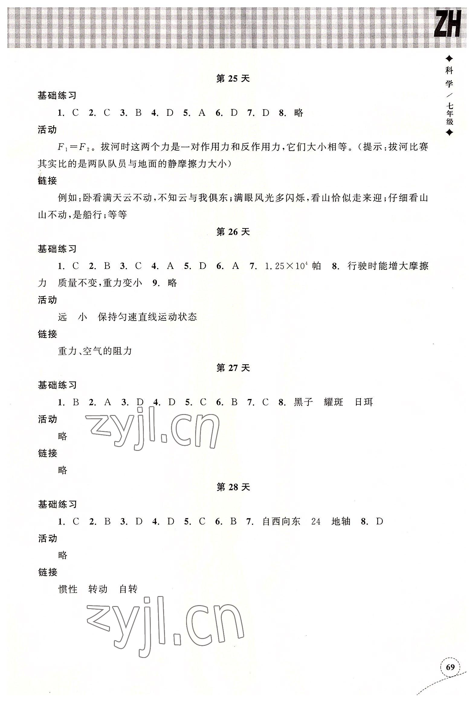 2022年暑假作业本浙江教育出版社七年级科学浙教版