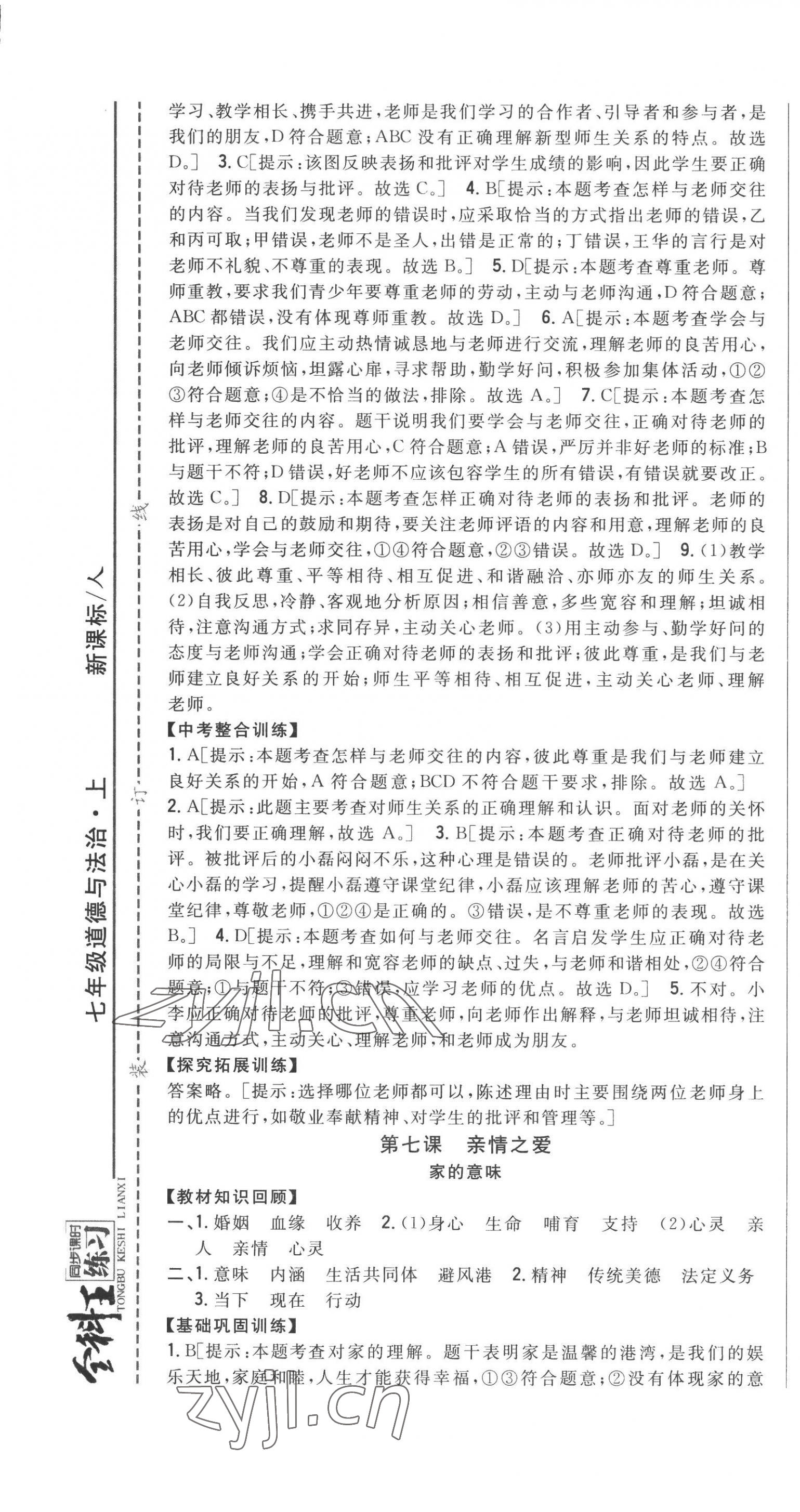 注:目前有些书本章节名称可能整理的还不是很完善,但都是按照顺序排列的,请同学们按照顺序仔细查找。练习册 2022年全科王同步课时练习七年级道德与法治上册人教版 答案主要是用来给同学们做完题方便对答案用的,请勿直接抄袭。