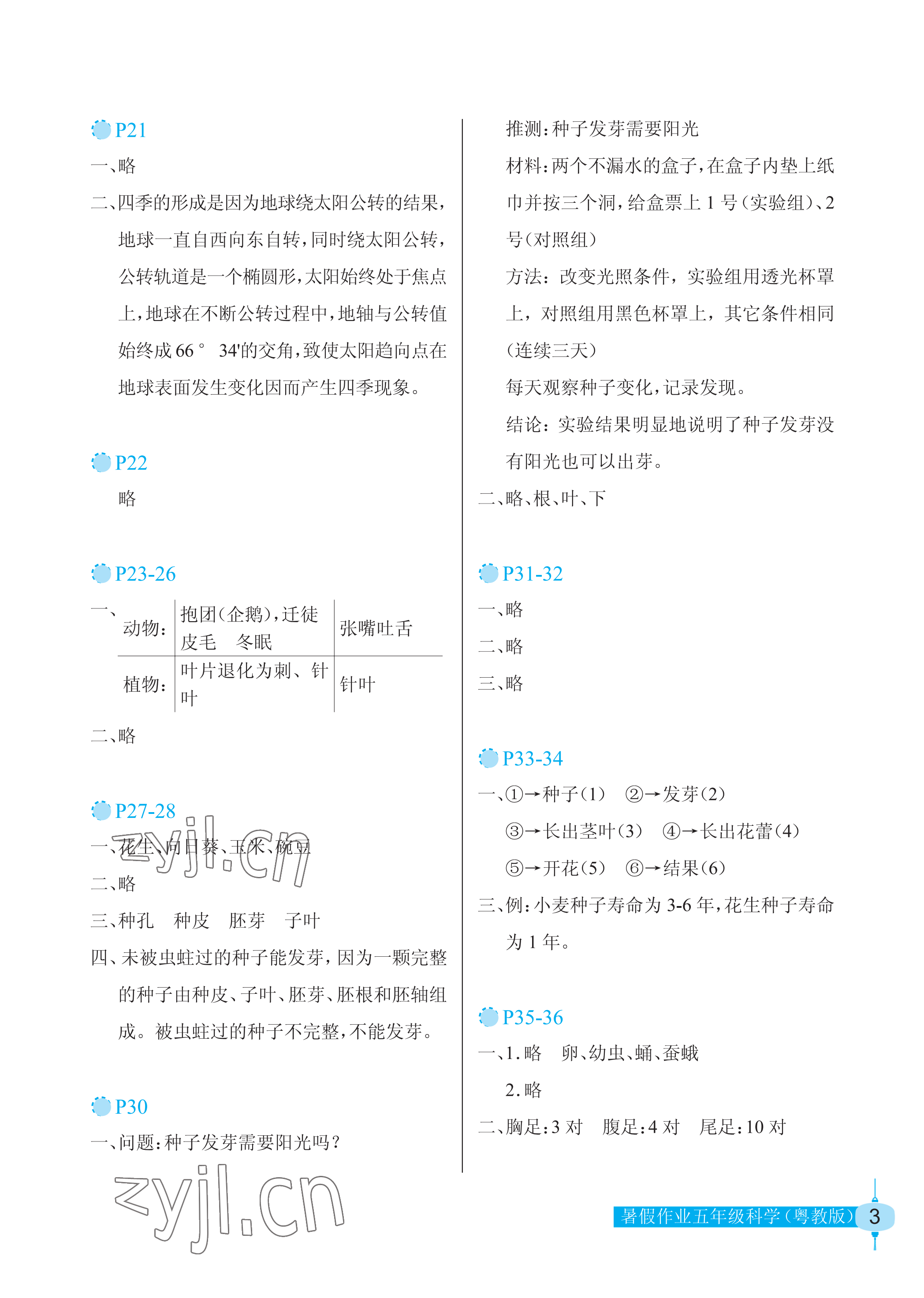 2022年暑假作业五年级科学粤教版长江少年儿童出版社
