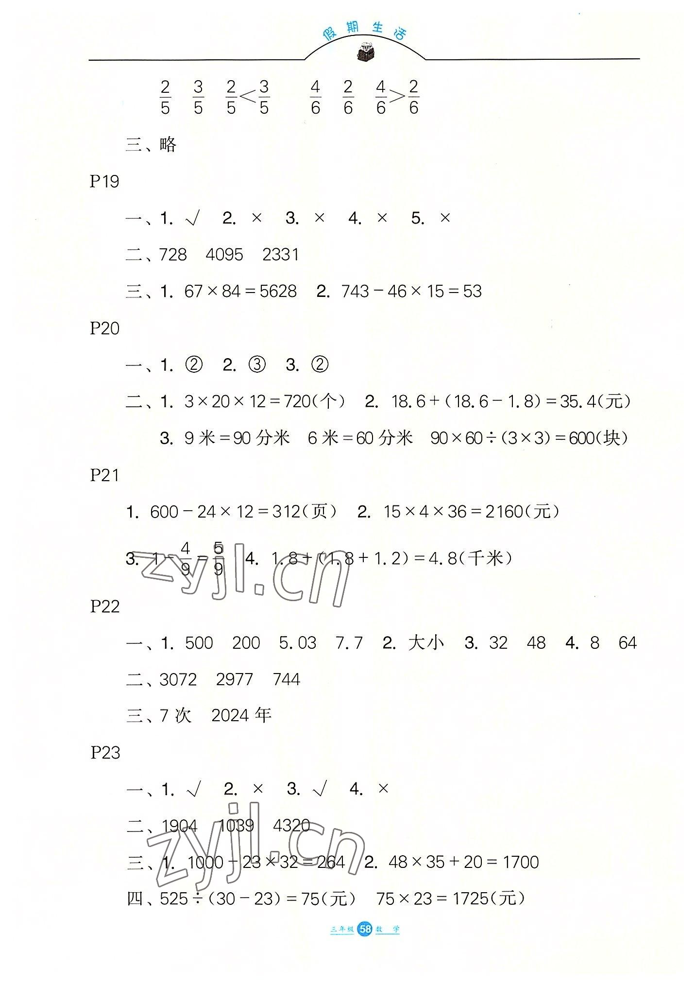 注:目前有些书本章节名称可能整理的还不是很完善,但都是按照顺序排列的,请同学们按照顺序仔细查找。练习册 2022年假期生活三年级数学冀教版方圆电子音像出版社 答案主要是用来给同学们做完题方便对答案用的,请勿直接抄袭。