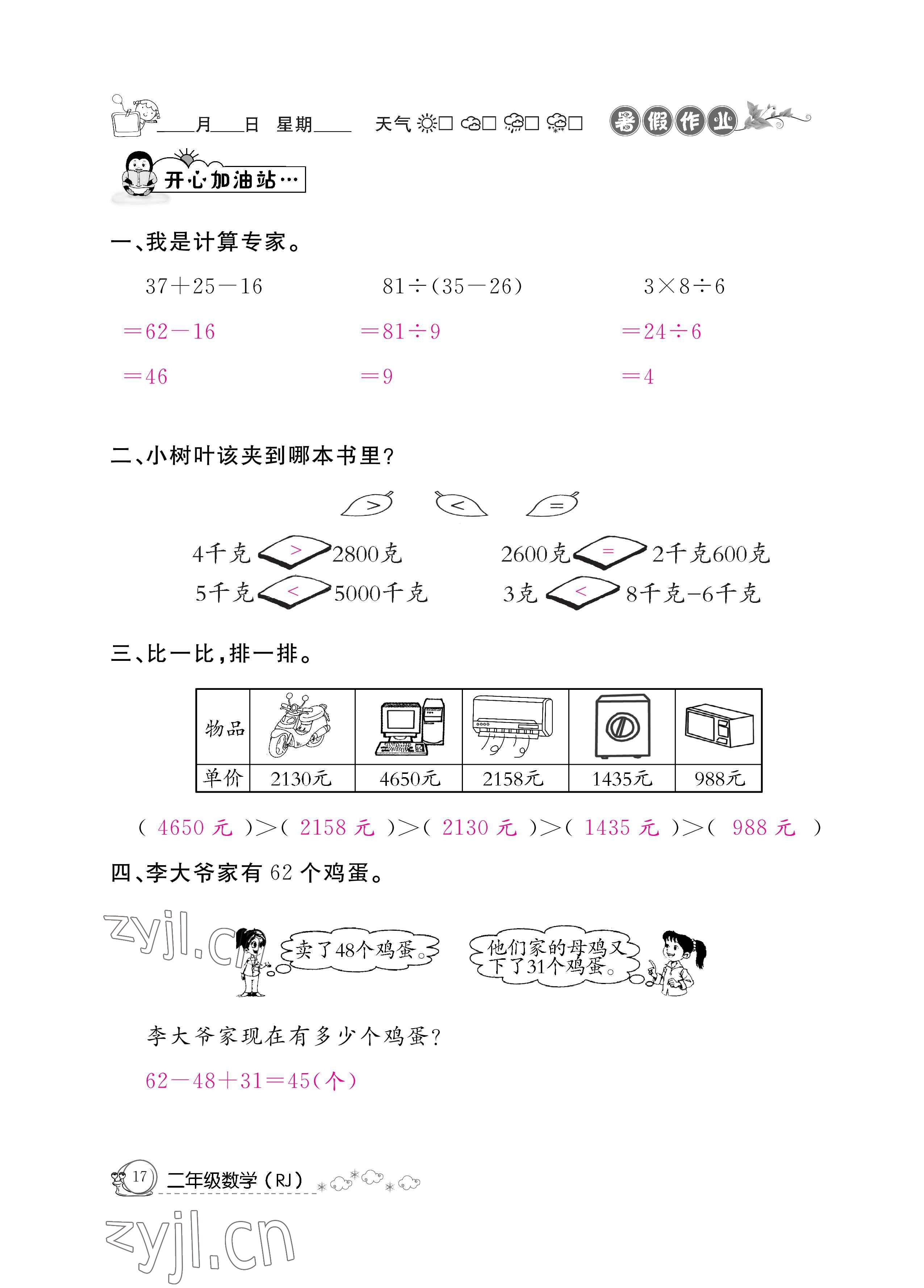 注:目前有些书本章节名称可能整理的还不是很完善,但都是按照顺序排列的,请同学们按照顺序仔细查找。练习册 2022年快乐假期暑假作业二年级数学人教版新疆专版 答案主要是用来给同学们做完题方便对答案用的,请勿直接抄袭。