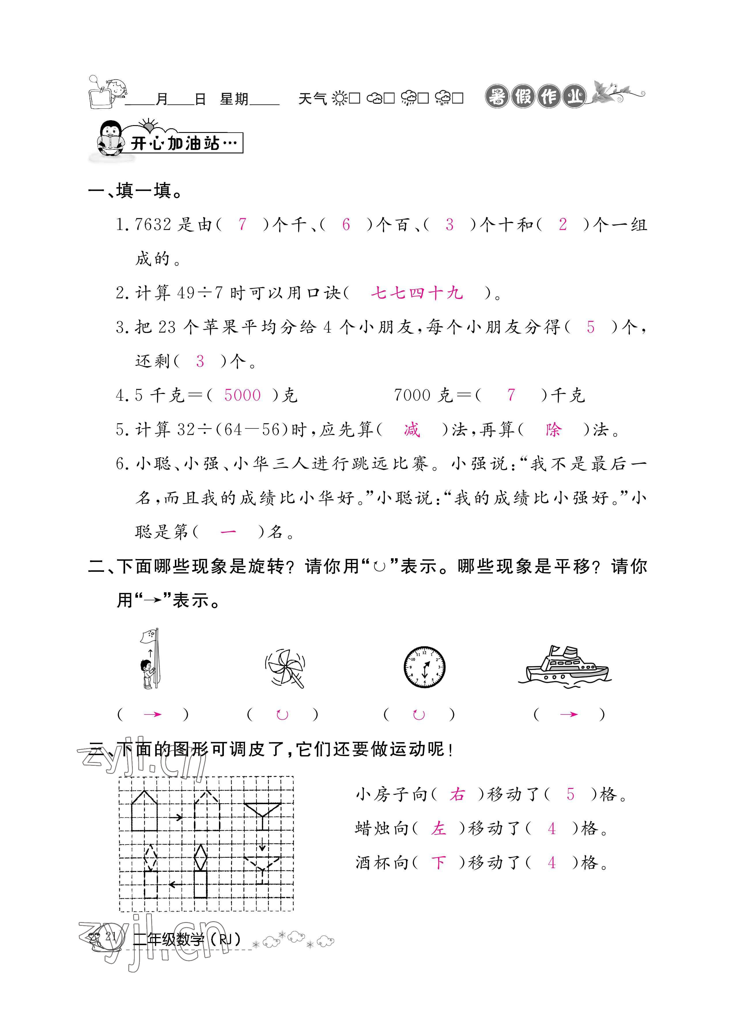 注:目前有些书本章节名称可能整理的还不是很完善,但都是按照顺序排列的,请同学们按照顺序仔细查找。练习册 2022年快乐假期暑假作业二年级数学人教版新疆专版 答案主要是用来给同学们做完题方便对答案用的,请勿直接抄袭。