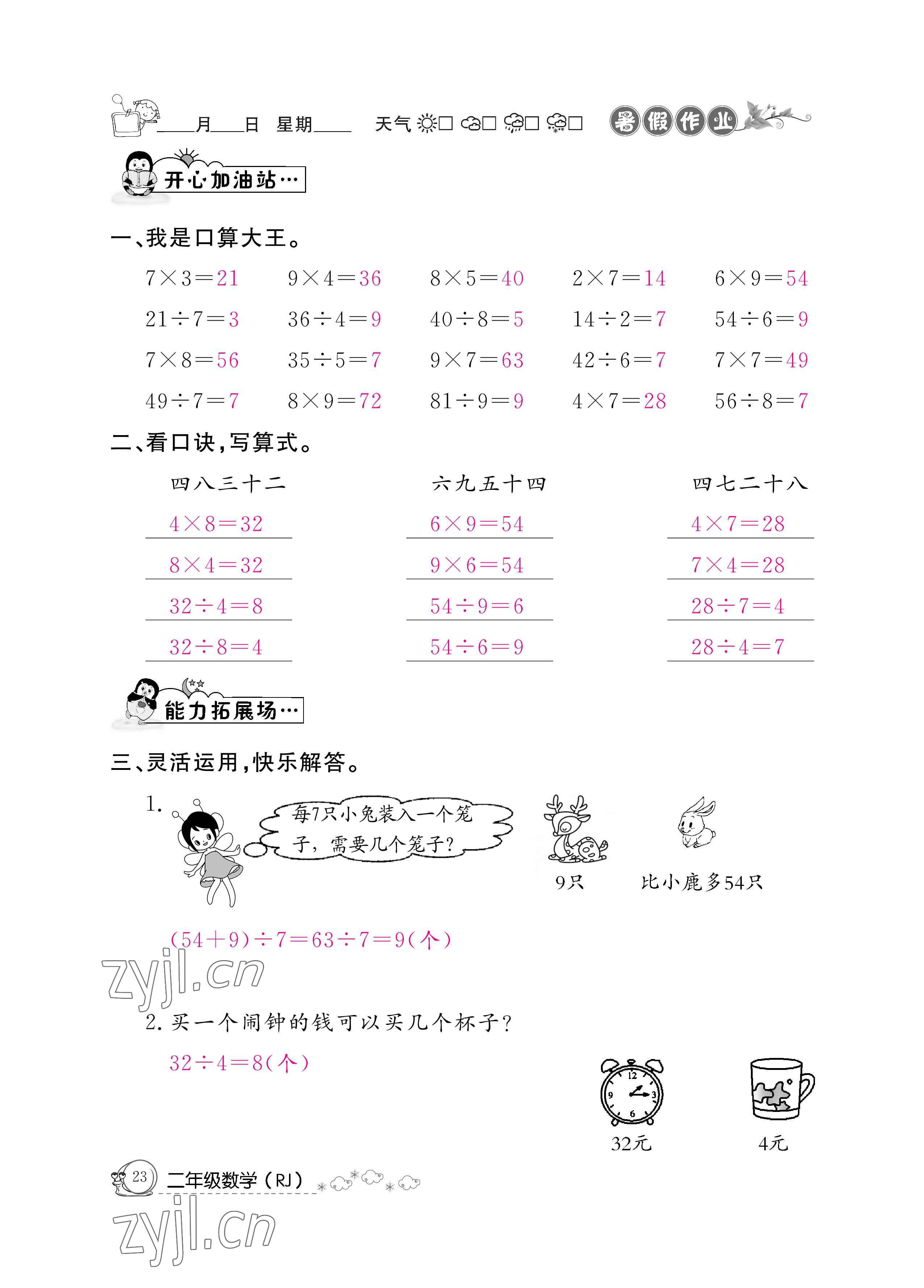2022年快乐假期暑假作业二年级数学人教版新疆专版