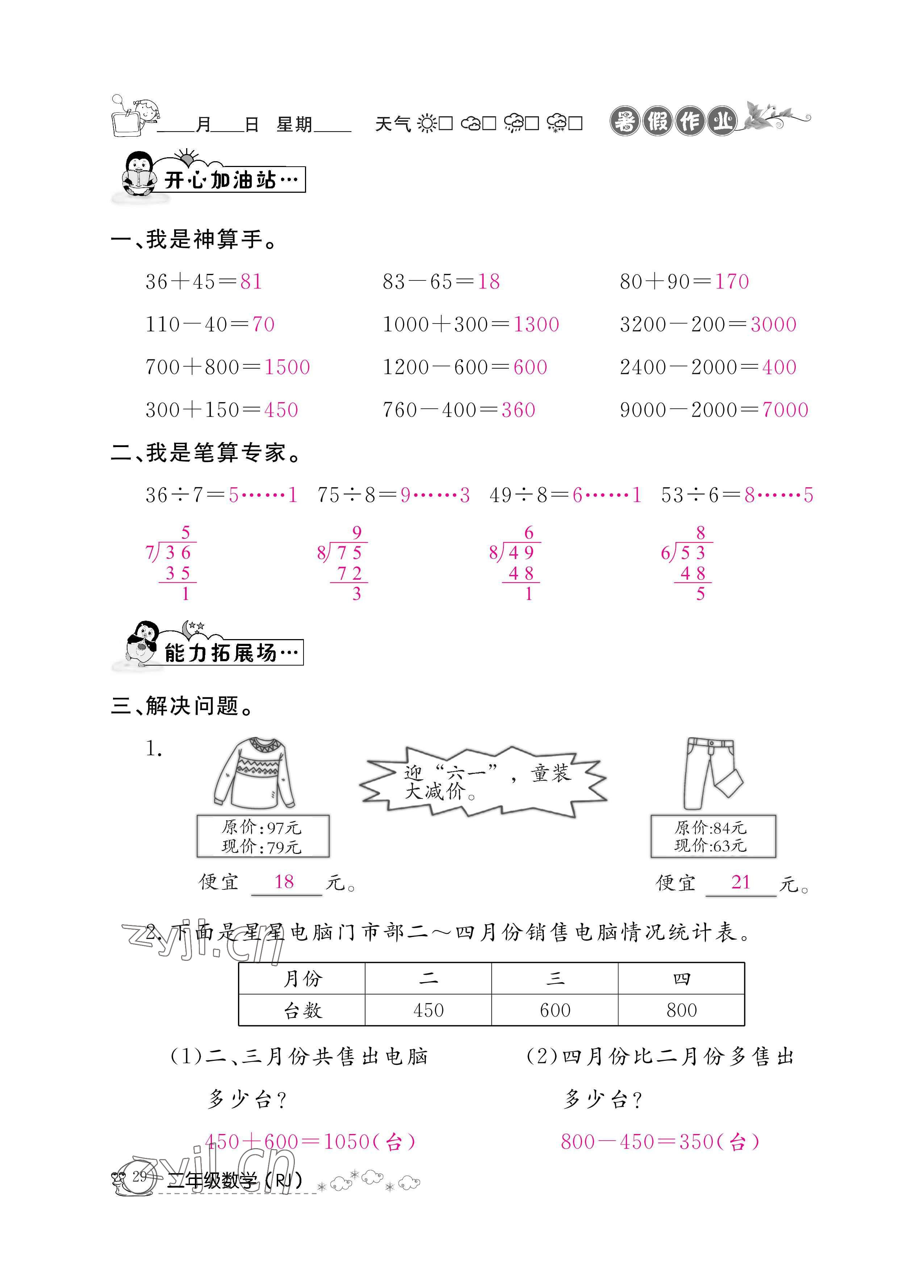 注:目前有些书本章节名称可能整理的还不是很完善,但都是按照顺序排列的,请同学们按照顺序仔细查找。练习册 2022年快乐假期暑假作业二年级数学人教版新疆专版 答案主要是用来给同学们做完题方便对答案用的,请勿直接抄袭。