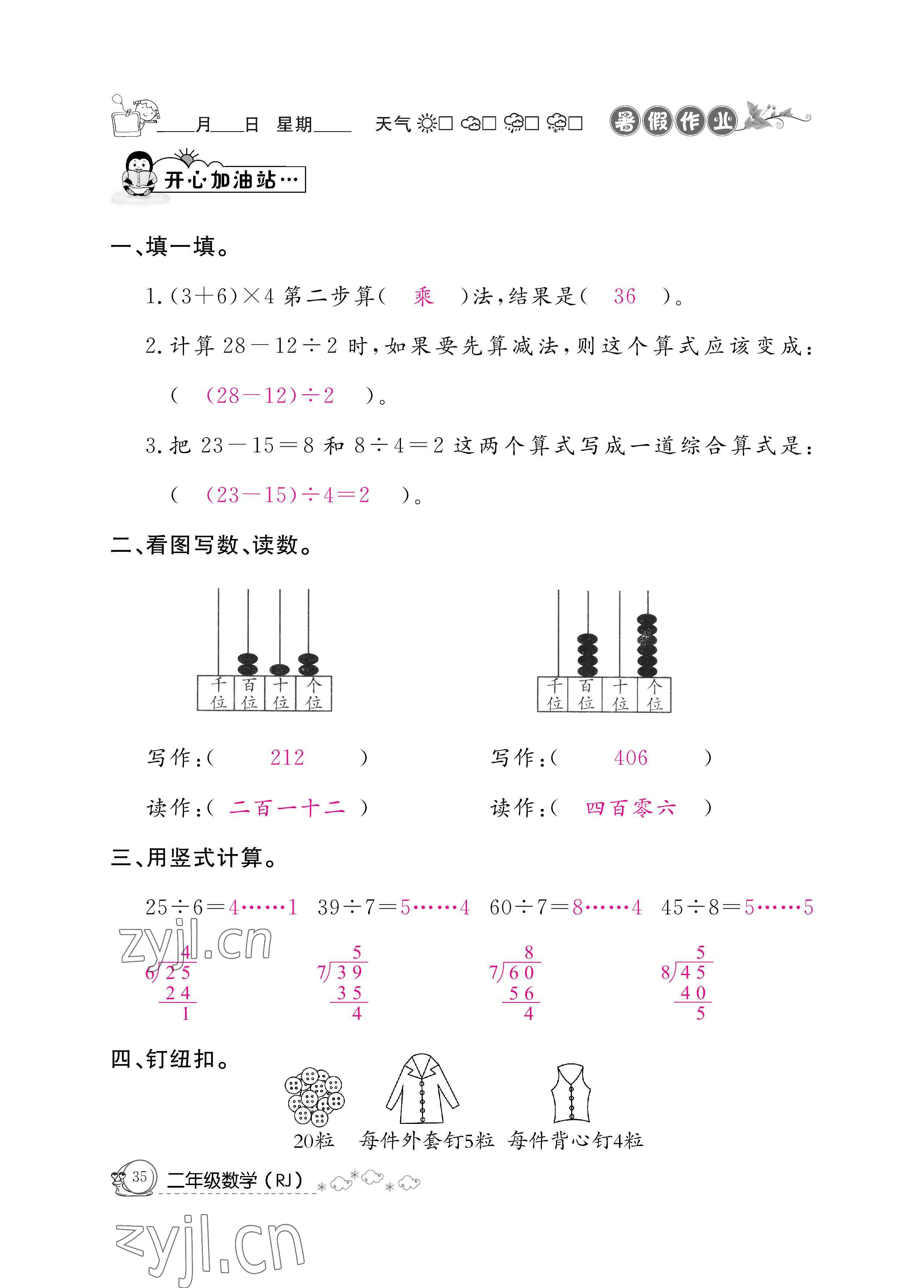 注:目前有些书本章节名称可能整理的还不是很完善,但都是按照顺序排列的,请同学们按照顺序仔细查找。练习册 2022年快乐假期暑假作业二年级数学人教版新疆专版 答案主要是用来给同学们做完题方便对答案用的,请勿直接抄袭。