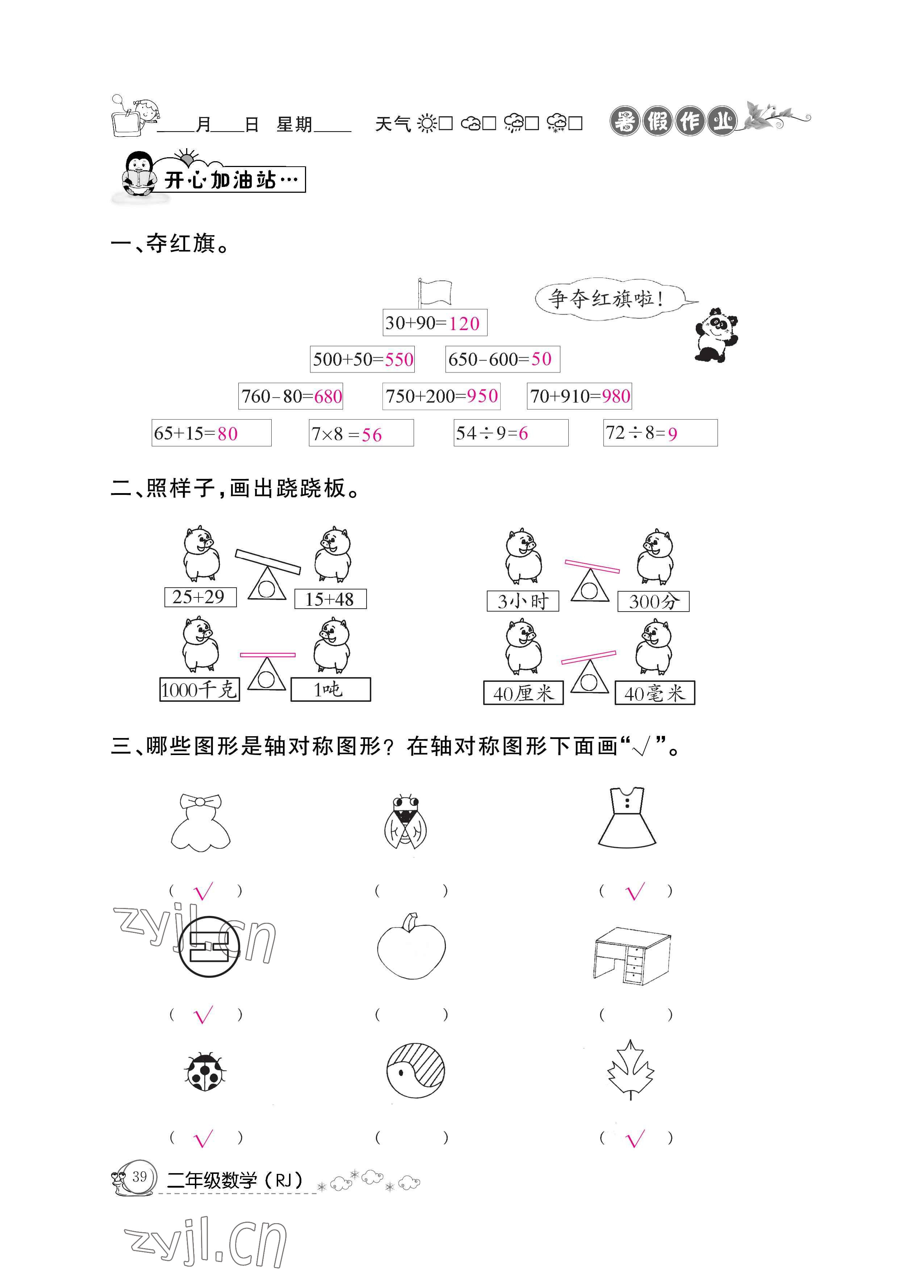 2022年快乐假期暑假作业二年级数学人教版新疆专版