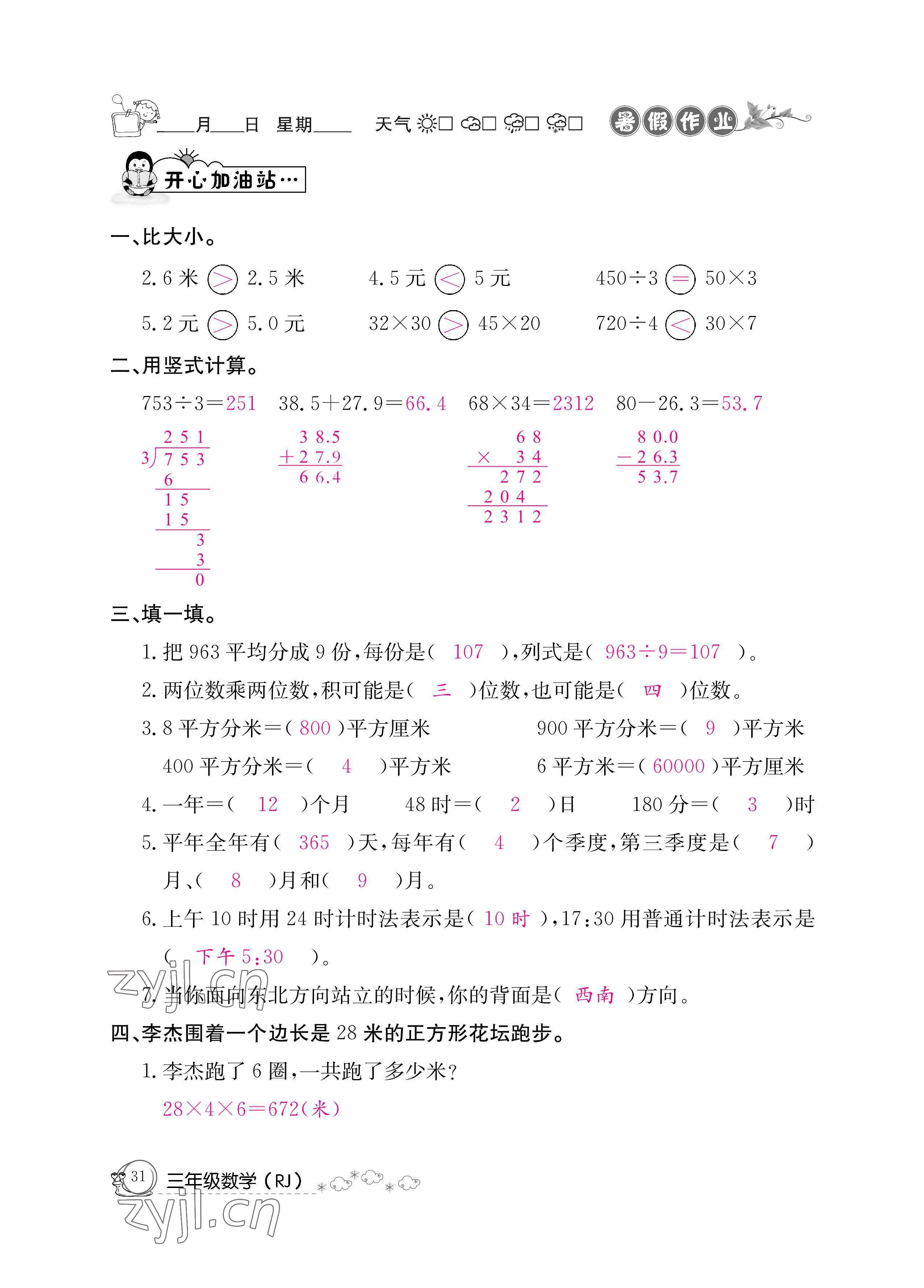 2022年暑假作业三年级数学人教版新疆专版延边教育出版社