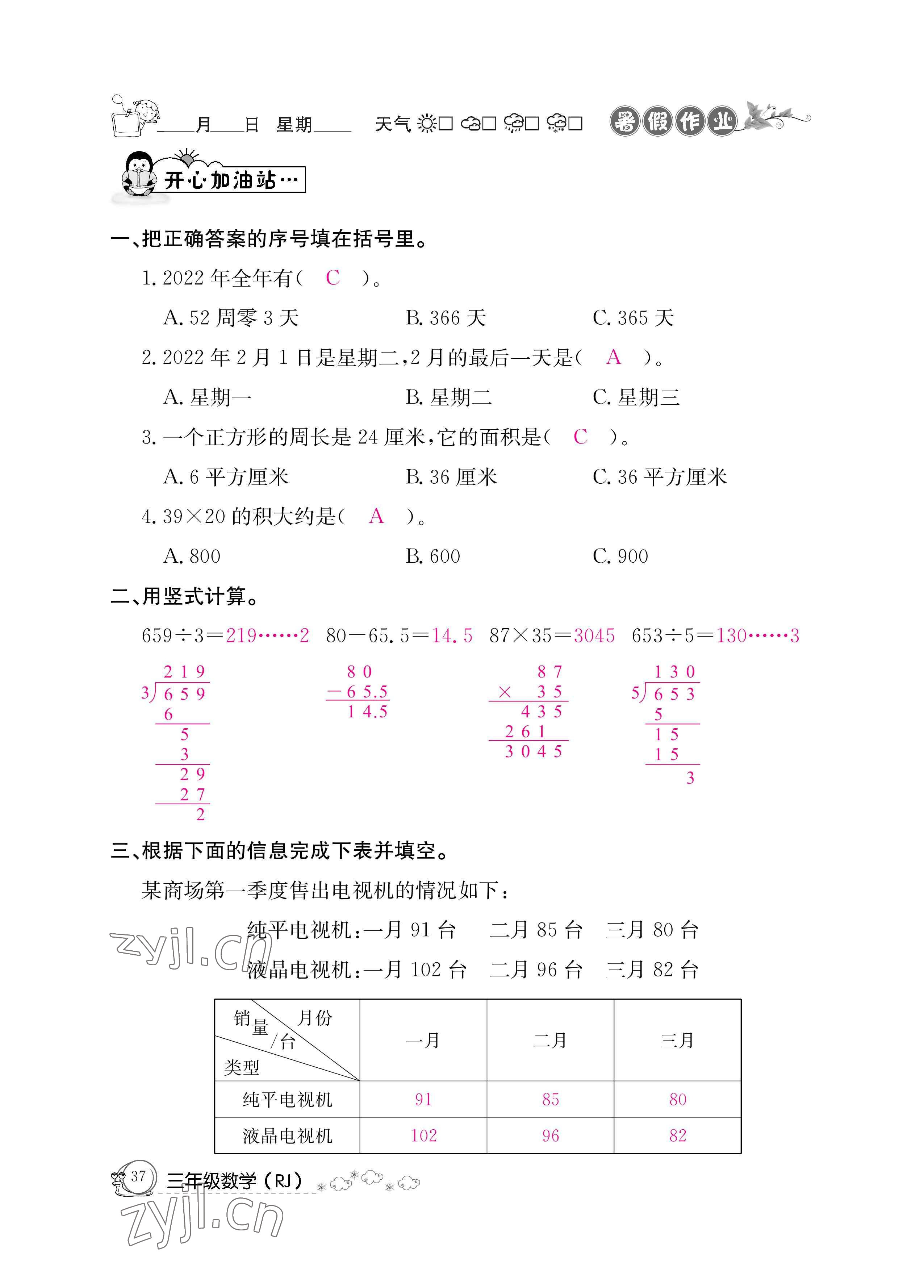 2022年暑假作业三年级数学人教版新疆专版延边教育出版社