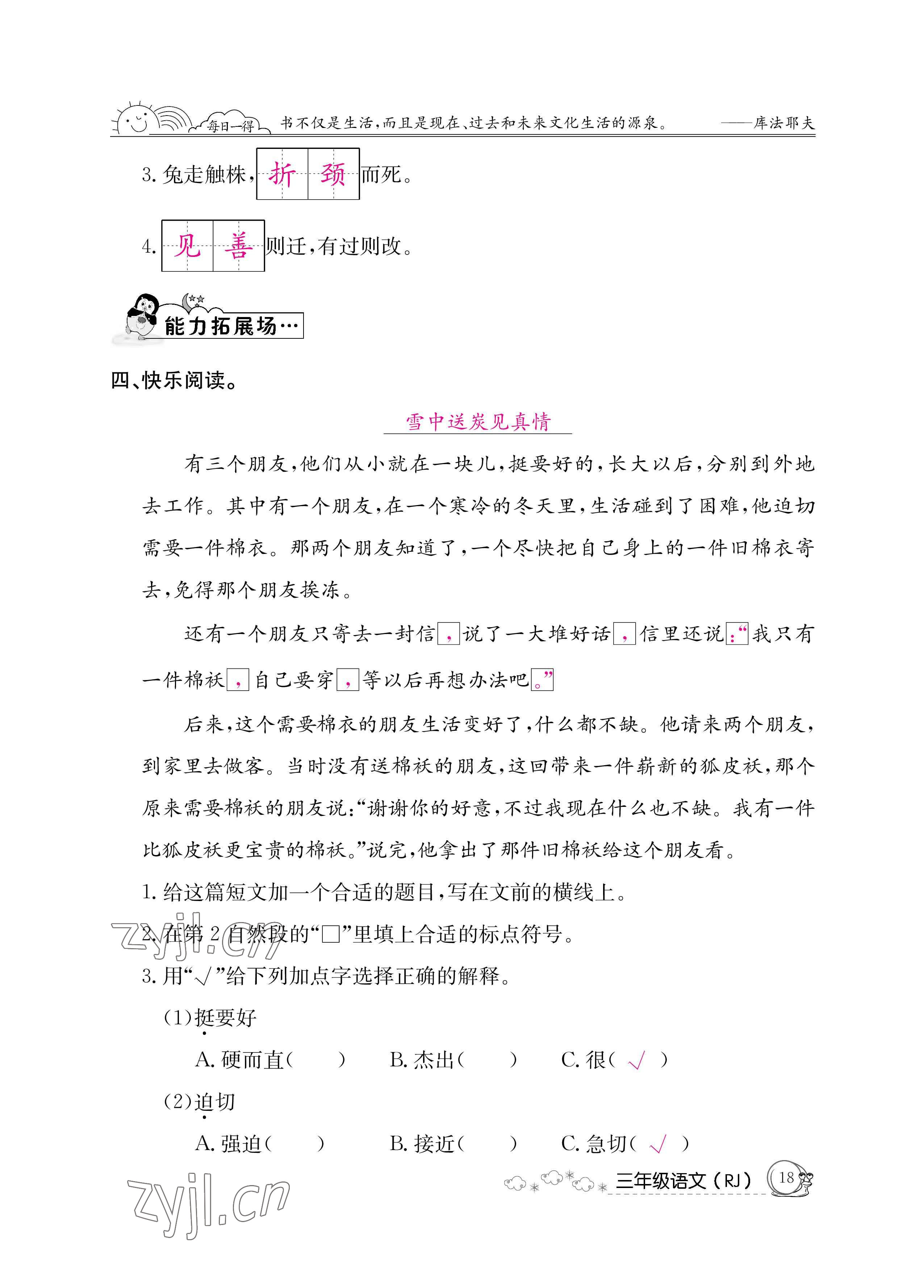 注:目前有些书本章节名称可能整理的还不是很完善,但都是按照顺序排列的,请同学们按照顺序仔细查找。练习册 2022年暑假作业三年级语文人教版新疆专版延边教育出版社 答案主要是用来给同学们做完题方便对答案用的,请勿直接抄袭。