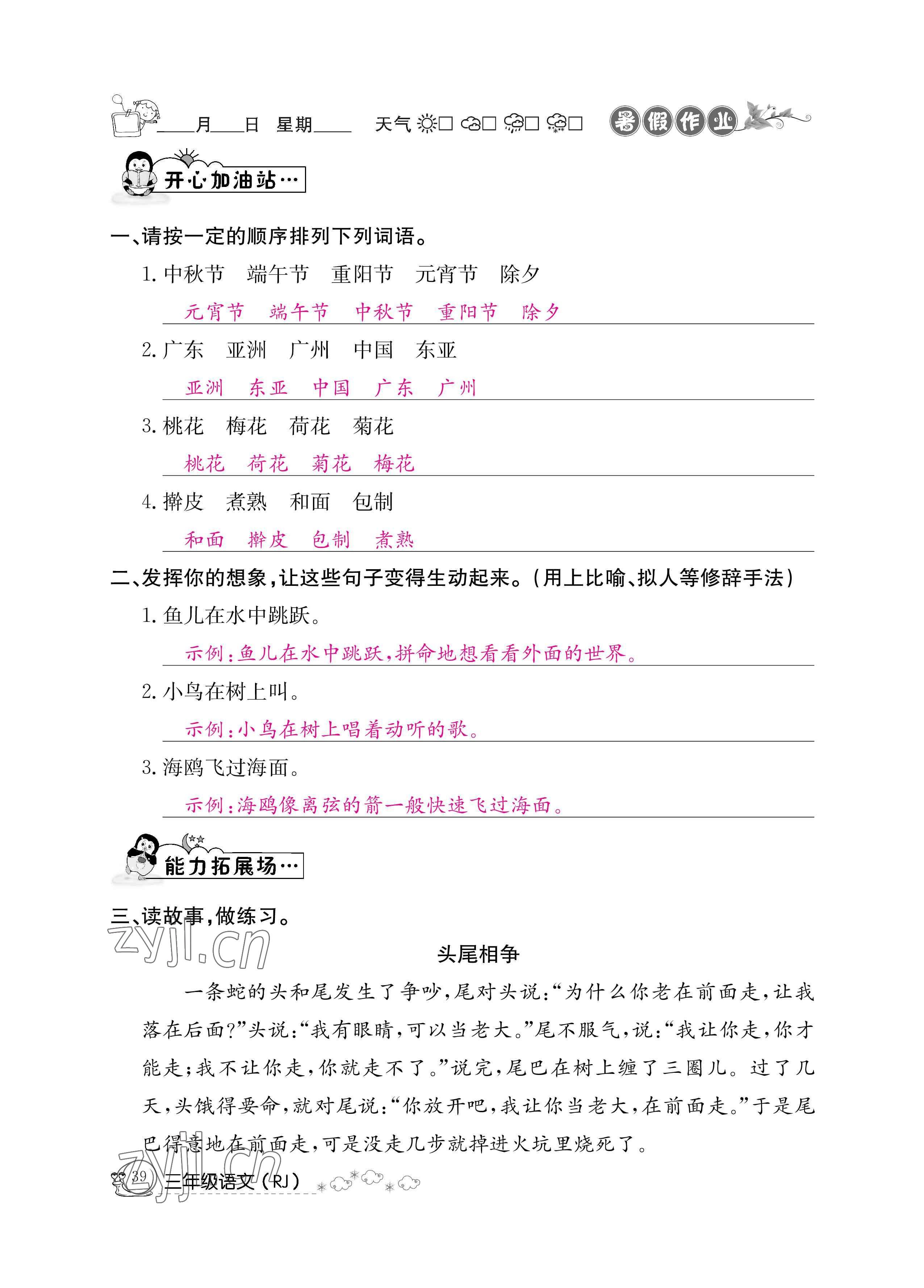 2022年暑假作业三年级语文人教版新疆专版延边教育出版社