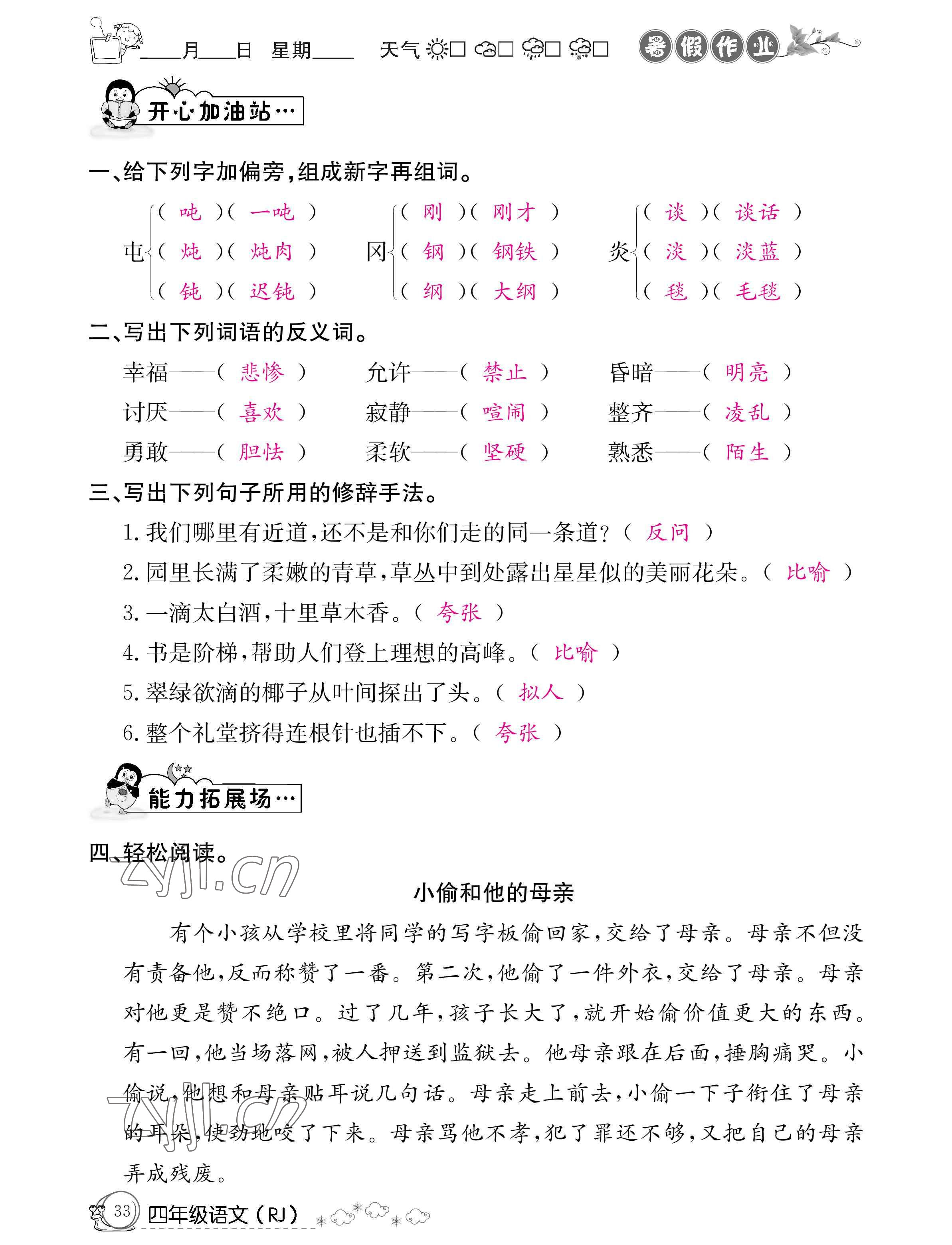 2022年暑假作业四年级语文人教版新疆专版延边教育出版社