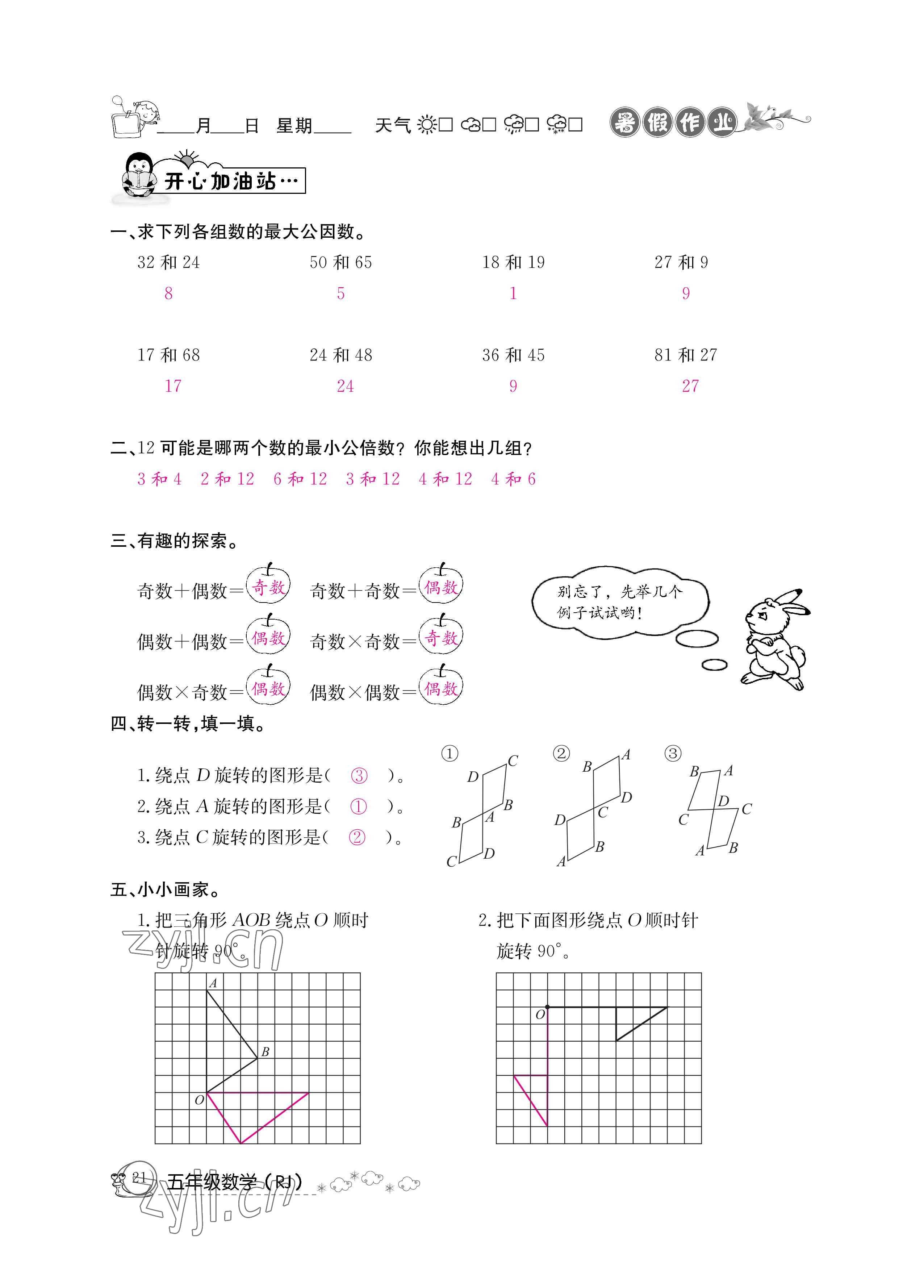 2022年暑假作业五年级数学新疆专版延边教育出版社