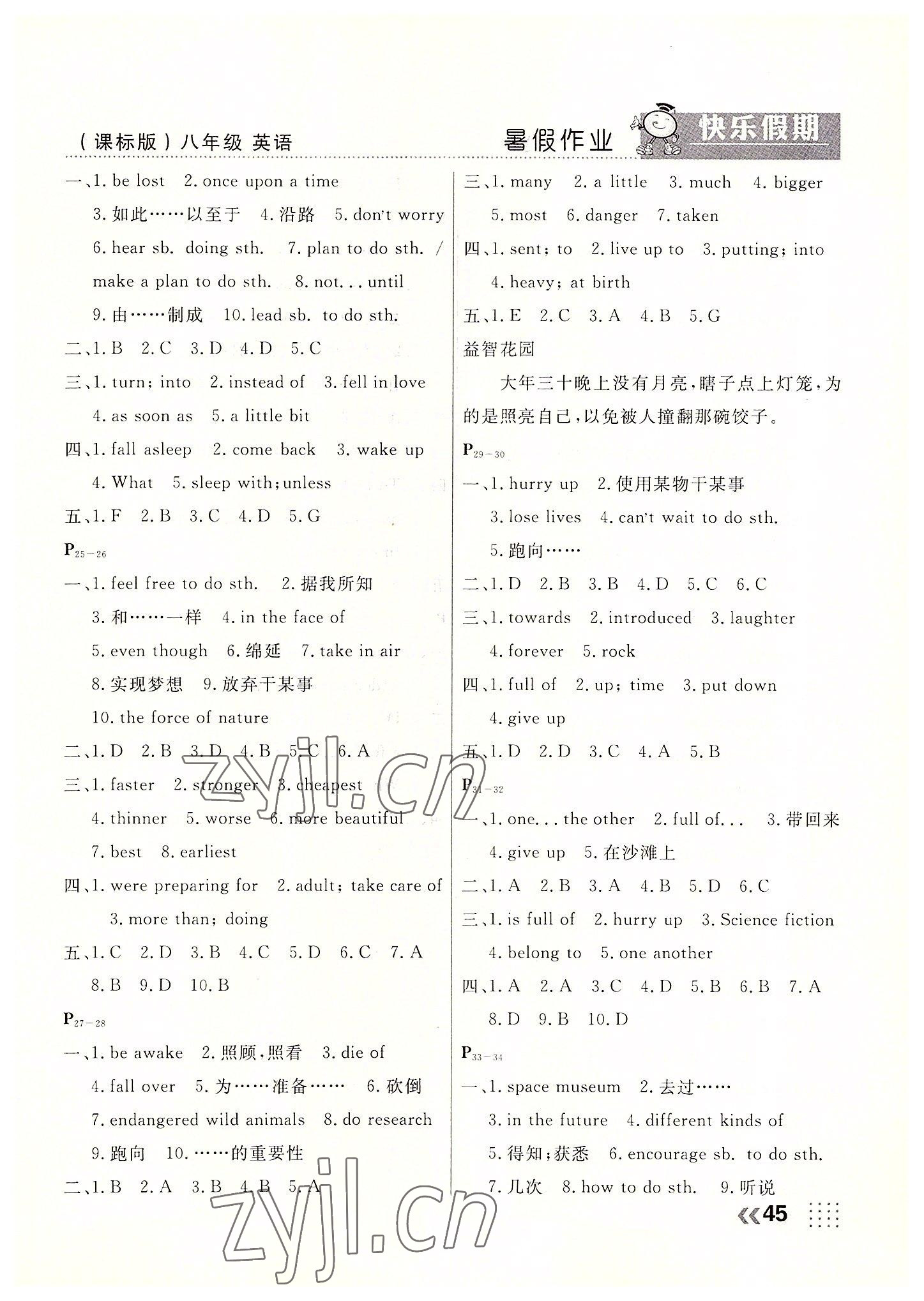 注:目前有些书本章节名称可能整理的还不是很完善,但都是按照顺序排列的,请同学们按照顺序仔细查找。练习册 2022年暑假作业本土假期八年级英语课标版 答案主要是用来给同学们做完题方便对答案用的,请勿直接抄袭。