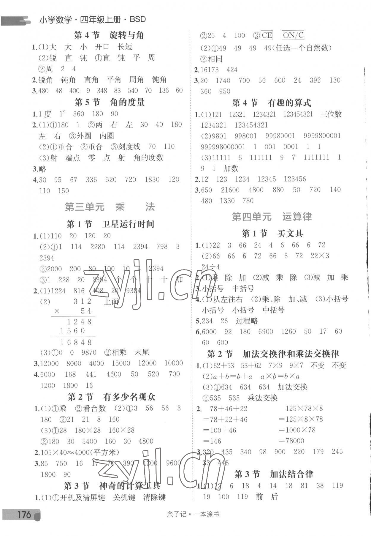 注:目前有些书本章节名称可能整理的还不是很完善,但都是按照顺序排列的,请同学们按照顺序仔细查找。练习册 2022年一本涂书四年级数学上册北师大版 答案主要是用来给同学们做完题方便对答案用的,请勿直接抄袭。
