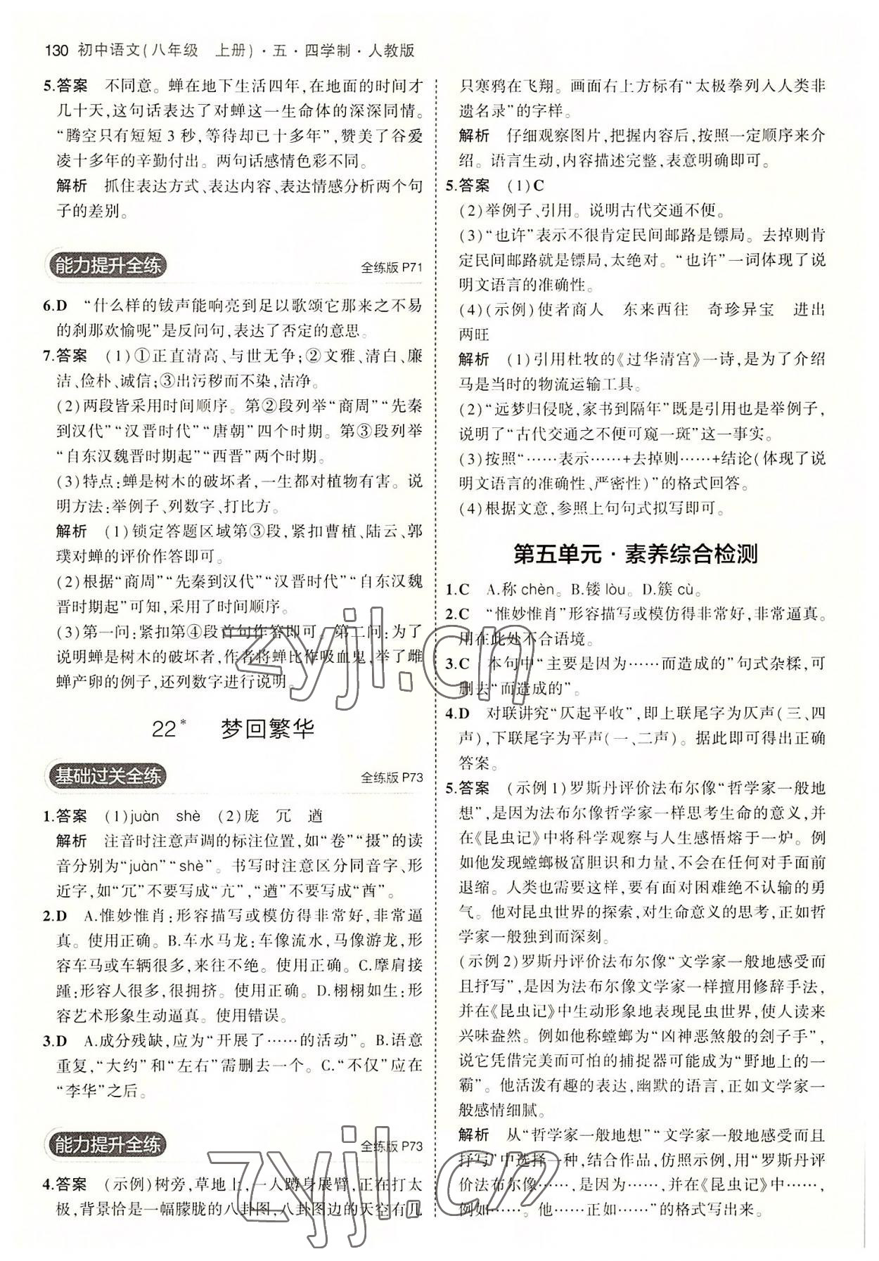 注:目前有些书本章节名称可能整理的还不是很完善,但都是按照顺序排列的,请同学们按照顺序仔细查找。练习册 2022年5年中考3年模拟初中语文八年级上册人教版五四制 答案主要是用来给同学们做完题方便对答案用的,请勿直接抄袭。