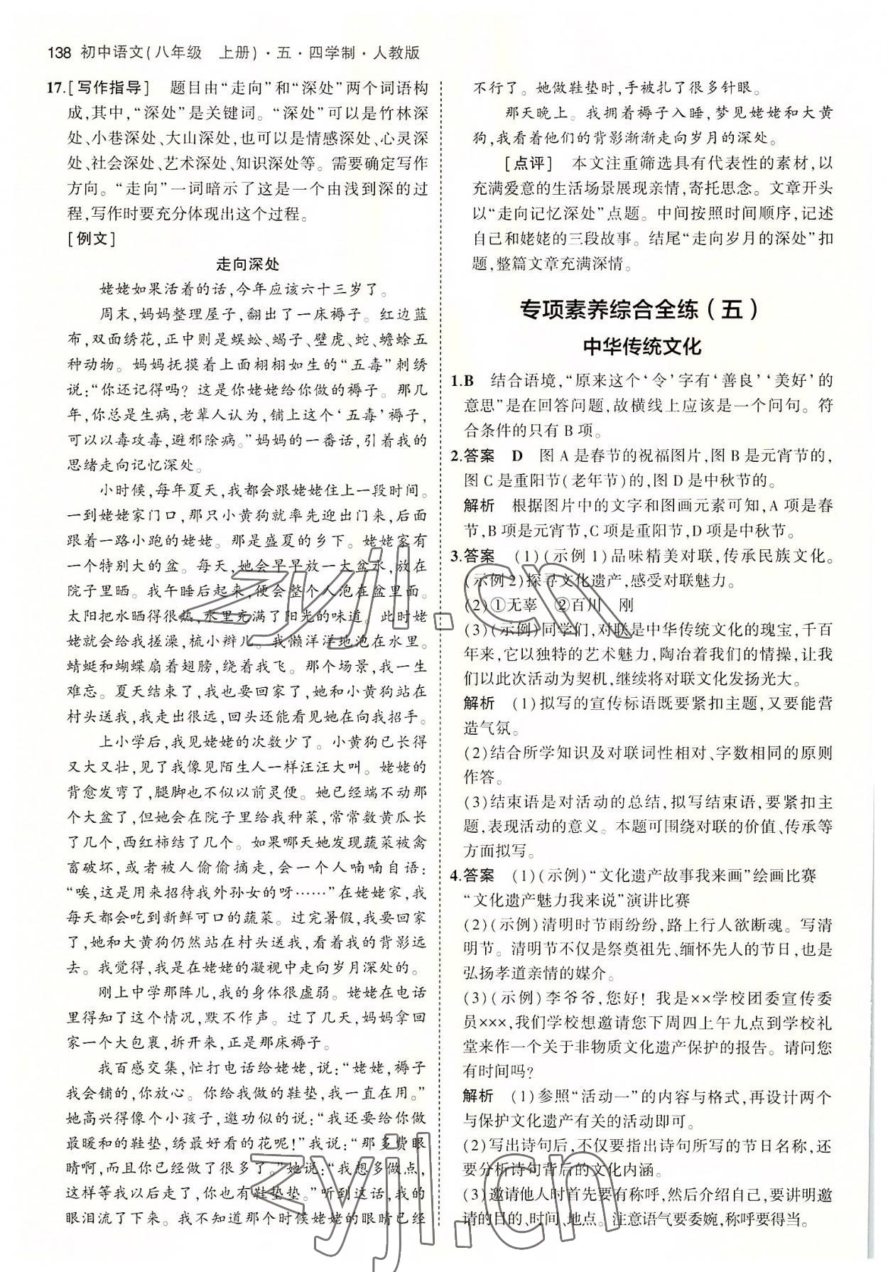 注:目前有些书本章节名称可能整理的还不是很完善,但都是按照顺序排列的,请同学们按照顺序仔细查找。练习册 2022年5年中考3年模拟初中语文八年级上册人教版五四制 答案主要是用来给同学们做完题方便对答案用的,请勿直接抄袭。