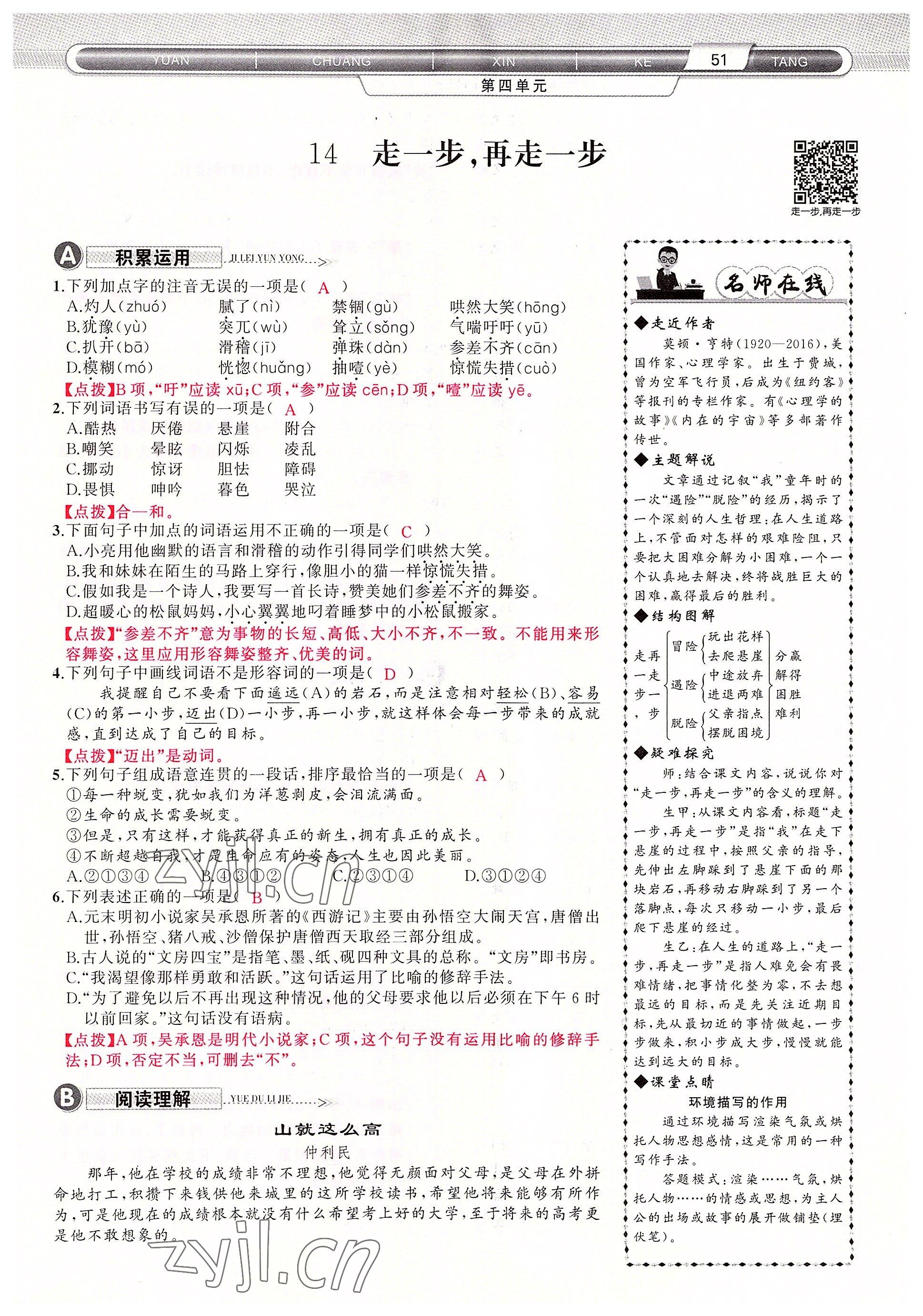 注:目前有些书本章节名称可能整理的还不是很完善,但都是按照顺序排列的,请同学们按照顺序仔细查找。练习册 2022年原创新课堂七年级语文上册人教版四川专版 答案主要是用来给同学们做完题方便对答案用的,请勿直接抄袭。