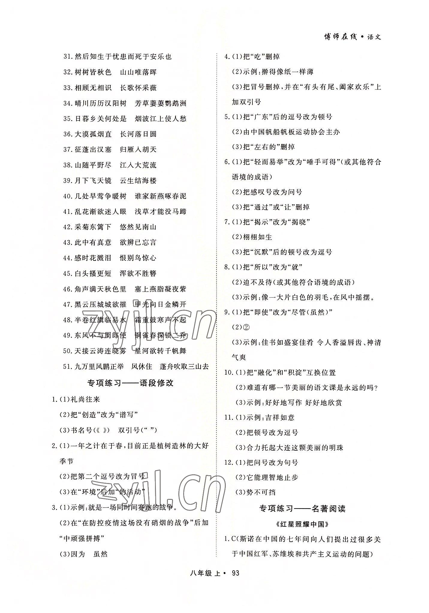 注:目前有些书本章节名称可能整理的还不是很完善,但都是按照顺序排列的,请同学们按照顺序仔细查找。练习册 2022年博师在线八年级语文上册人教版大连专版 答案主要是用来给同学们做完题方便对答案用的,请勿直接抄袭。