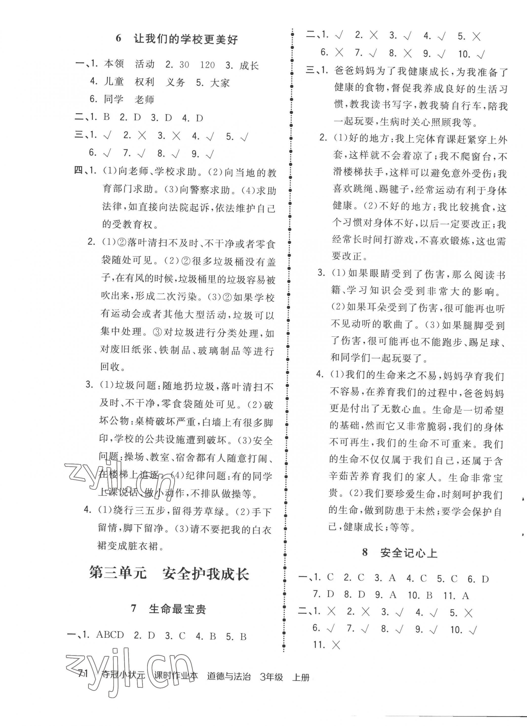 2022年夺冠小状元课时作业本三年级道德与法治上册人教版