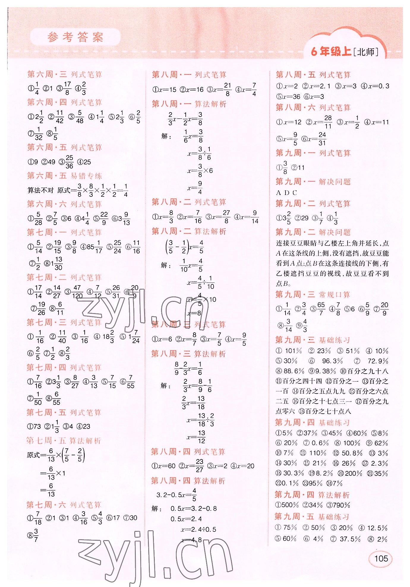 注:目前有些书本章节名称可能整理的还不是很完善,但都是按照顺序排列的,请同学们按照顺序仔细查找。练习册 2022年同步口算题卡六年级数学上册北师大版 答案主要是用来给同学们做完题方便对答案用的,请勿直接抄袭。