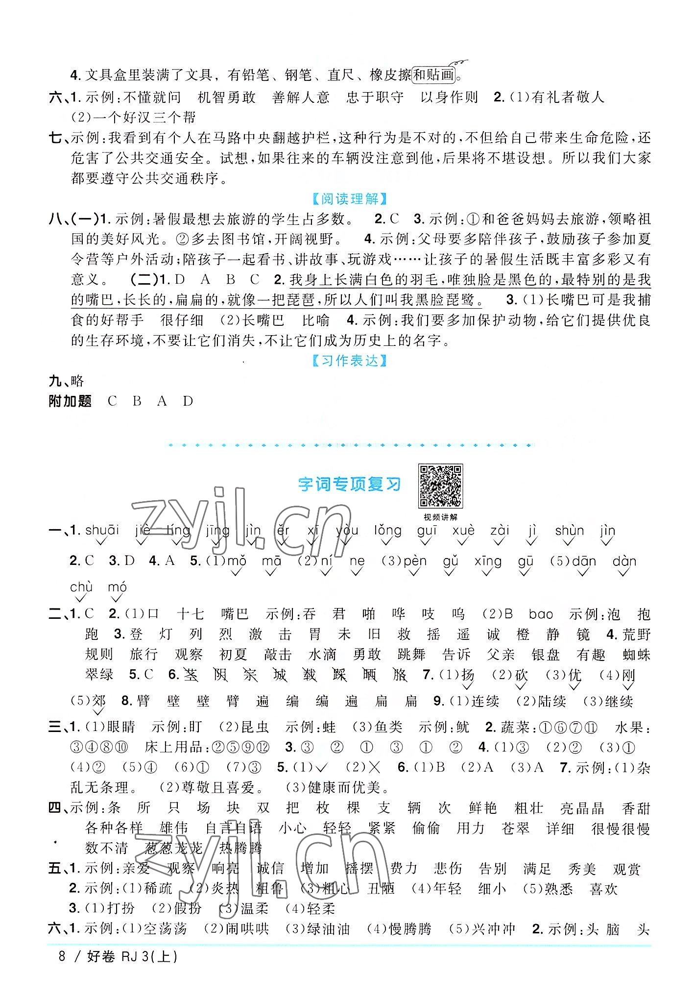 注:目前有些书本章节名称可能整理的还不是很完善,但都是按照顺序排列的,请同学们按照顺序仔细查找。练习册 2022年阳光同学一线名师全优好卷三年级语文上册人教版广东专版 答案主要是用来给同学们做完题方便对答案用的,请勿直接抄袭。